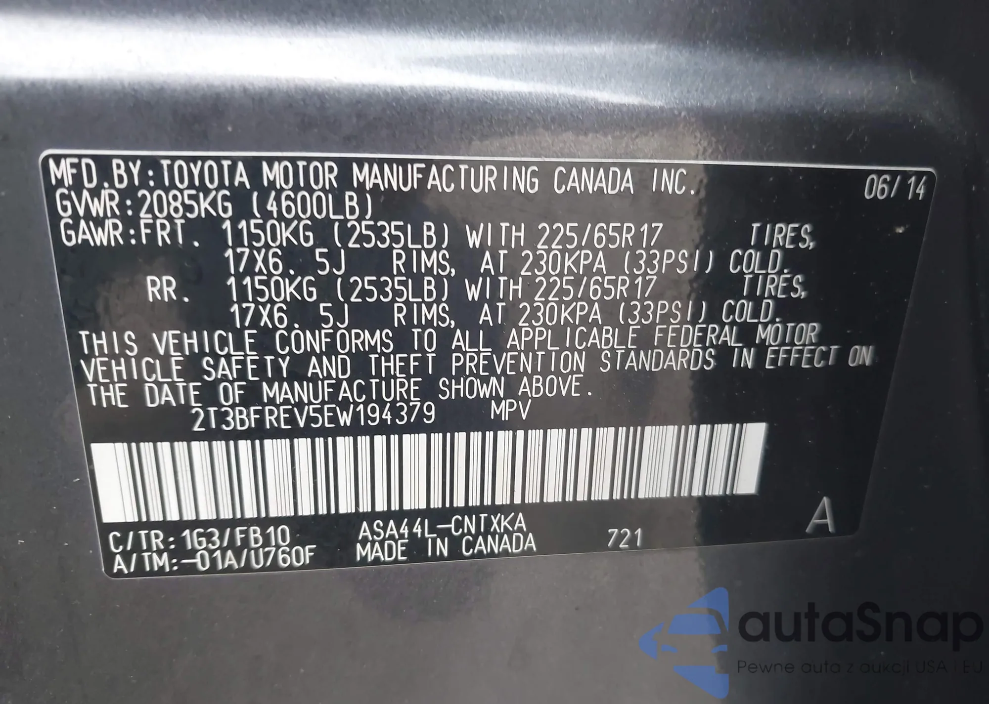 LOT: 43186325 VIN: 2T3BFREV5EW194379