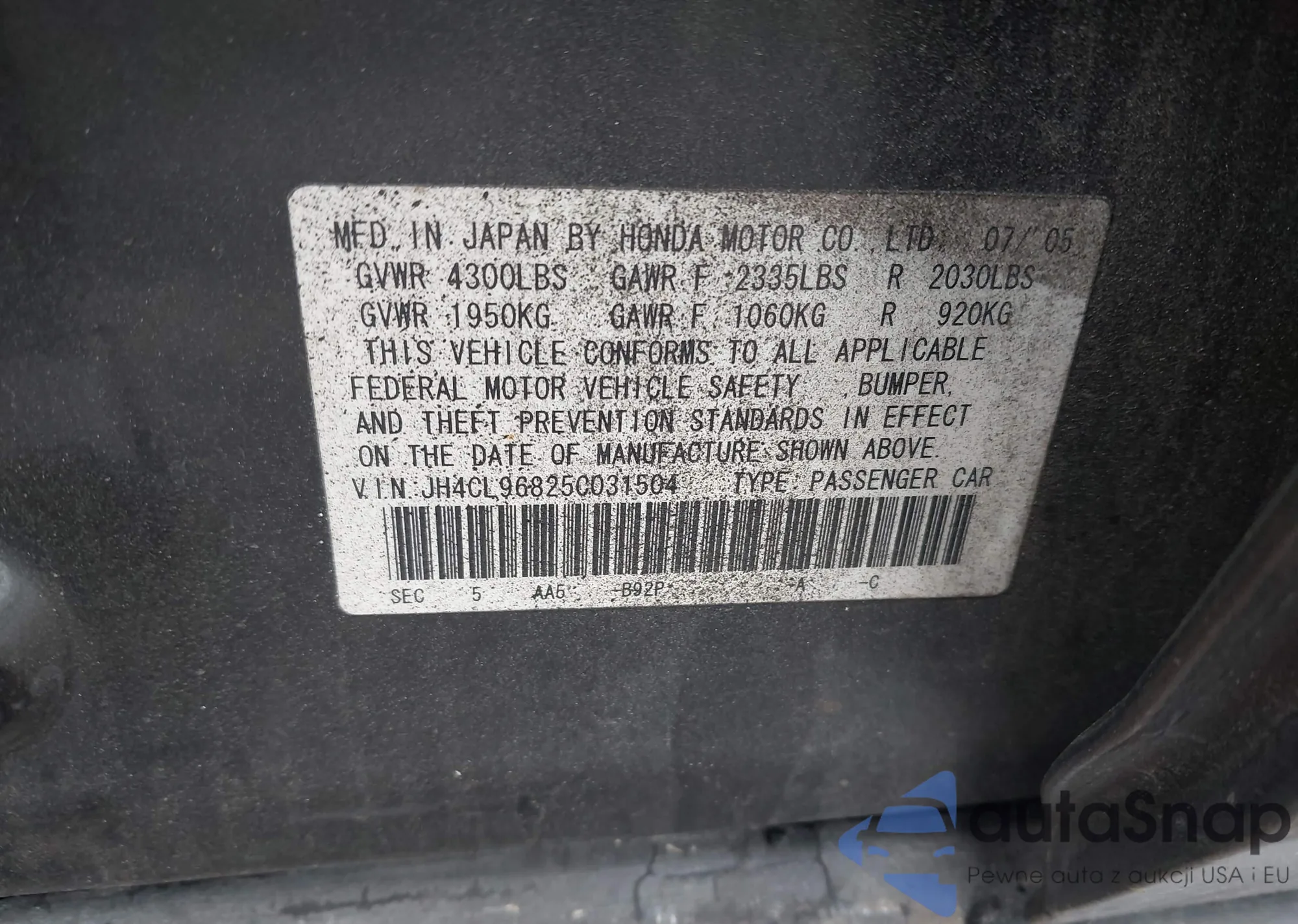 LOT: 43288652 VIN: JH4CL96825C031504