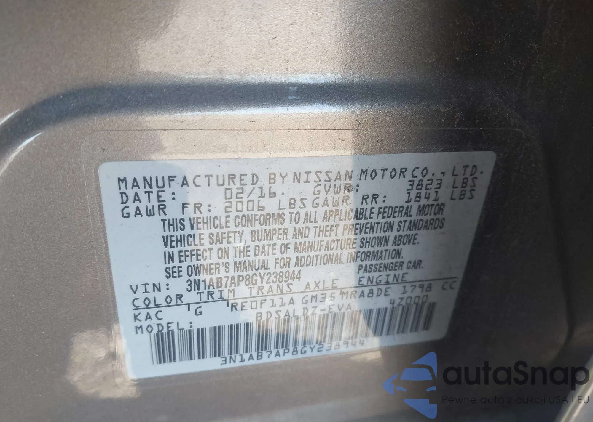 LOT: 43180977 VIN: 3N1AB7AP8GY238944