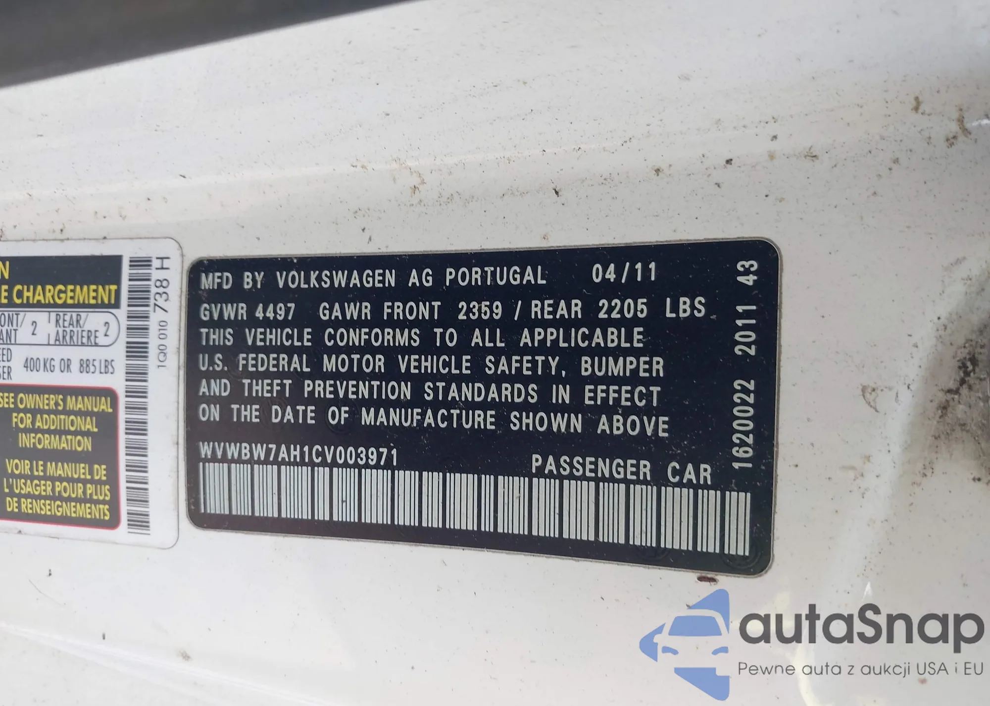 • VIN WVWBW7AH1CV003971