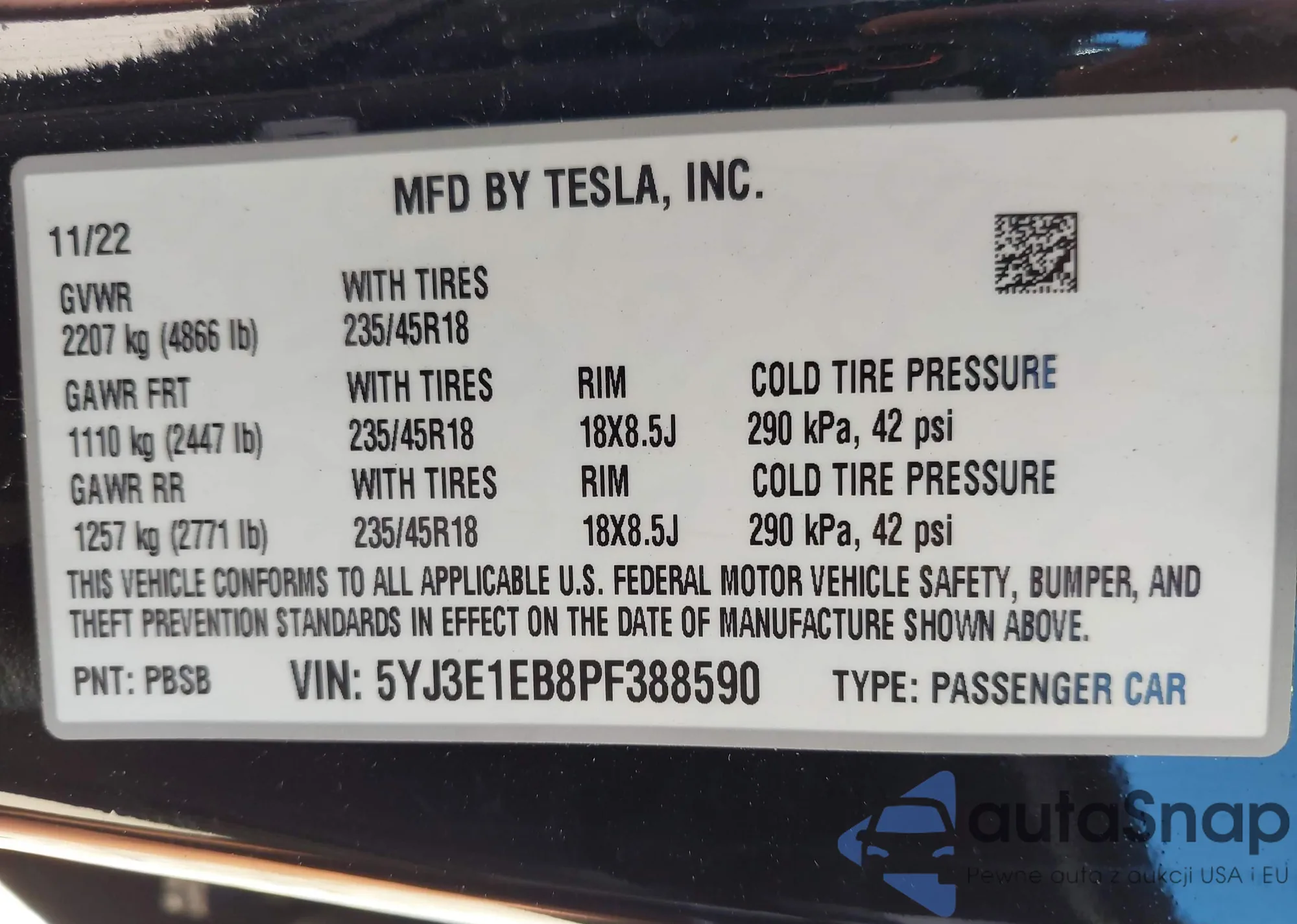 • VIN 5YJ3E1EB8PF388590