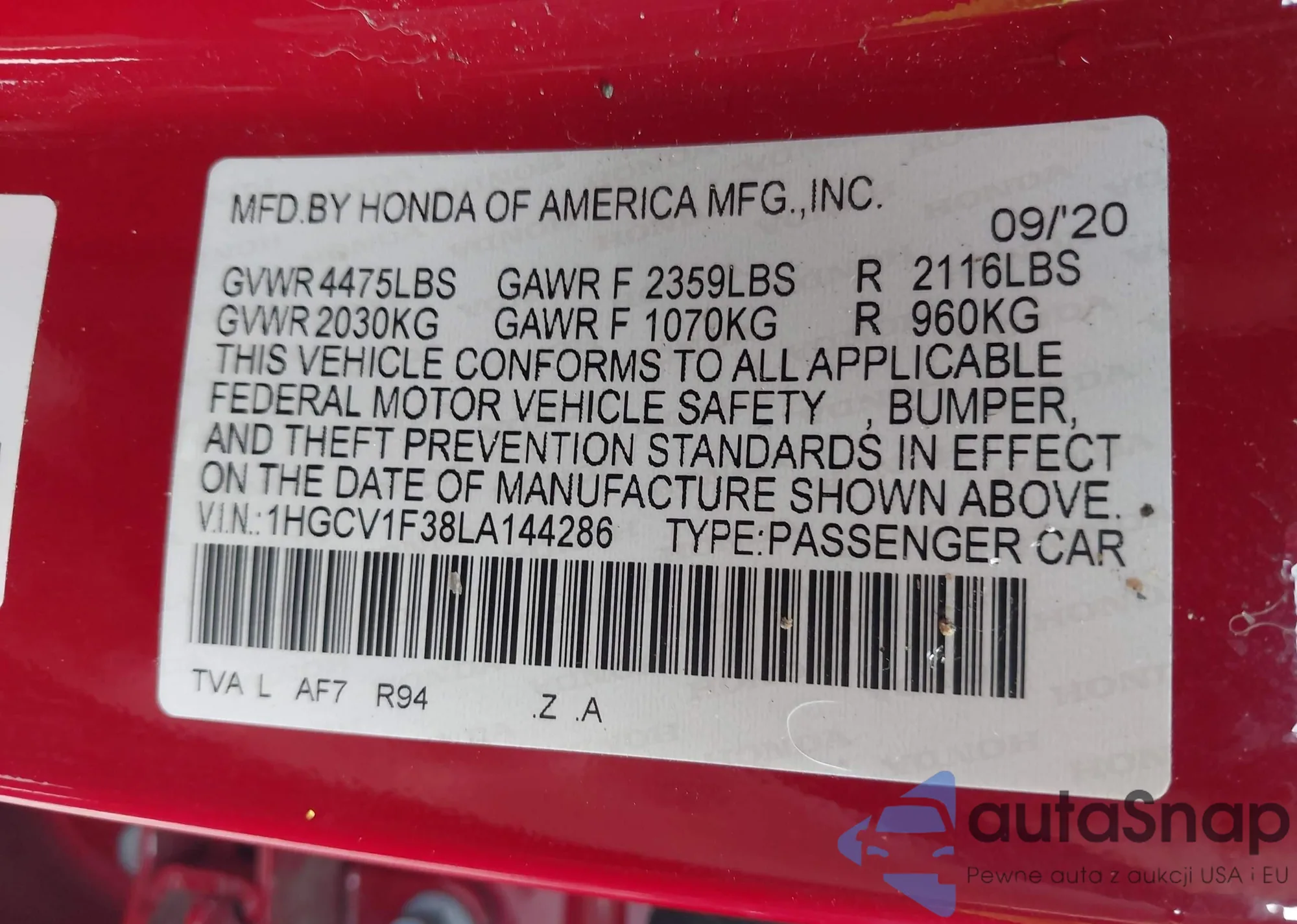 LOT: 42912291 VIN: 1HGCV1F38LA144286