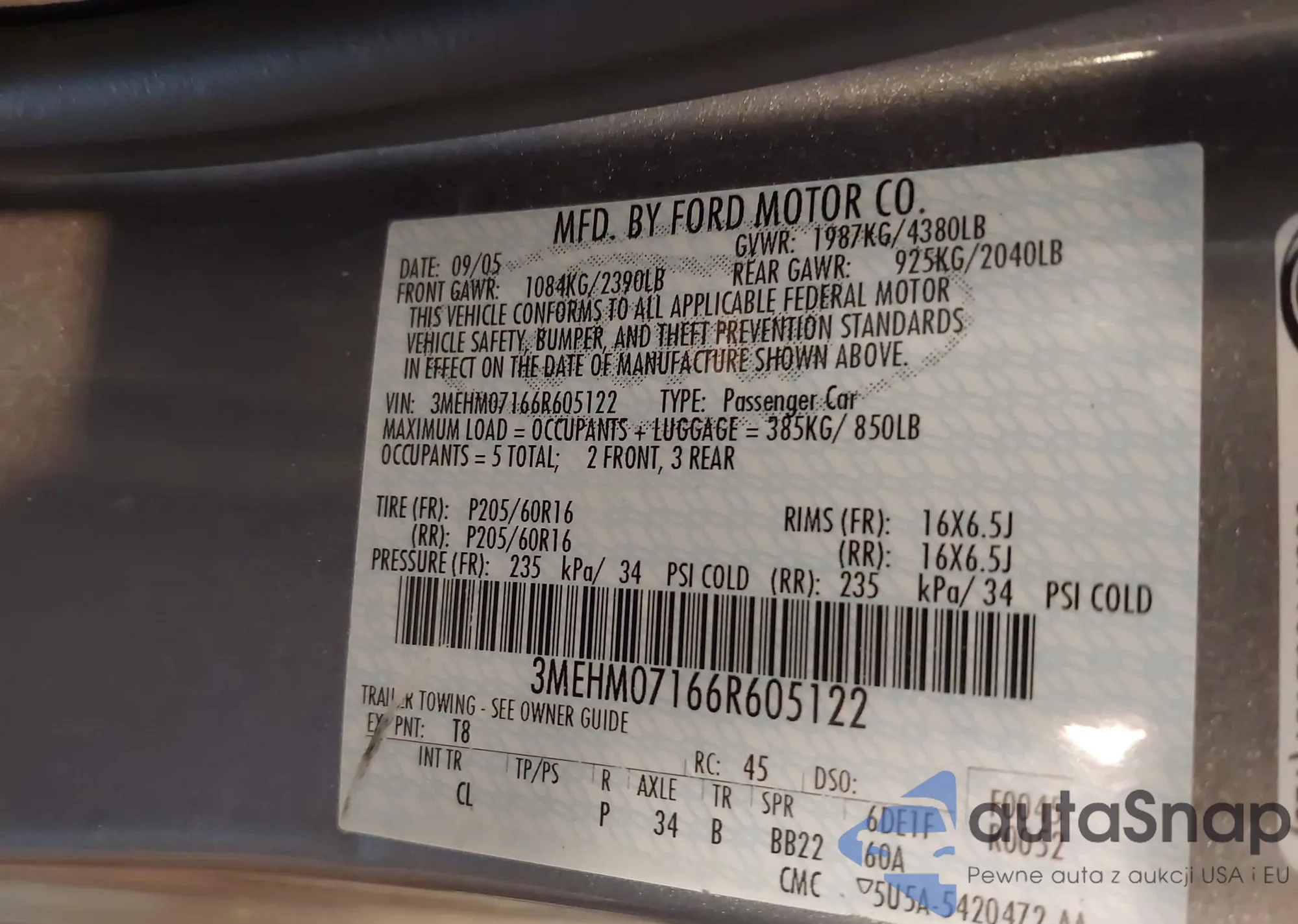 2006 Mercury Milan V6 из США, поврежденный, VIN 3MEHM07166R605122