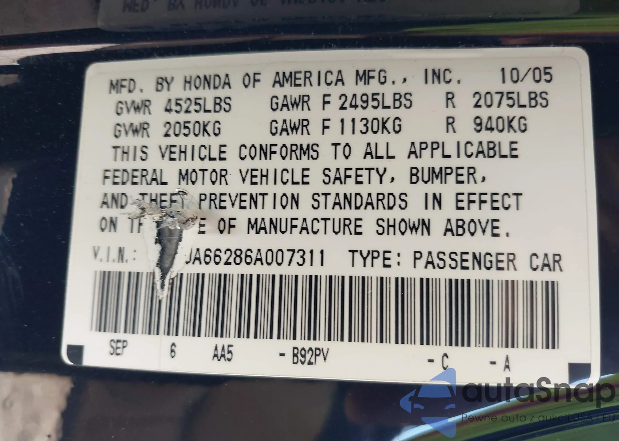 • VIN JHMFC1F9XKX005809