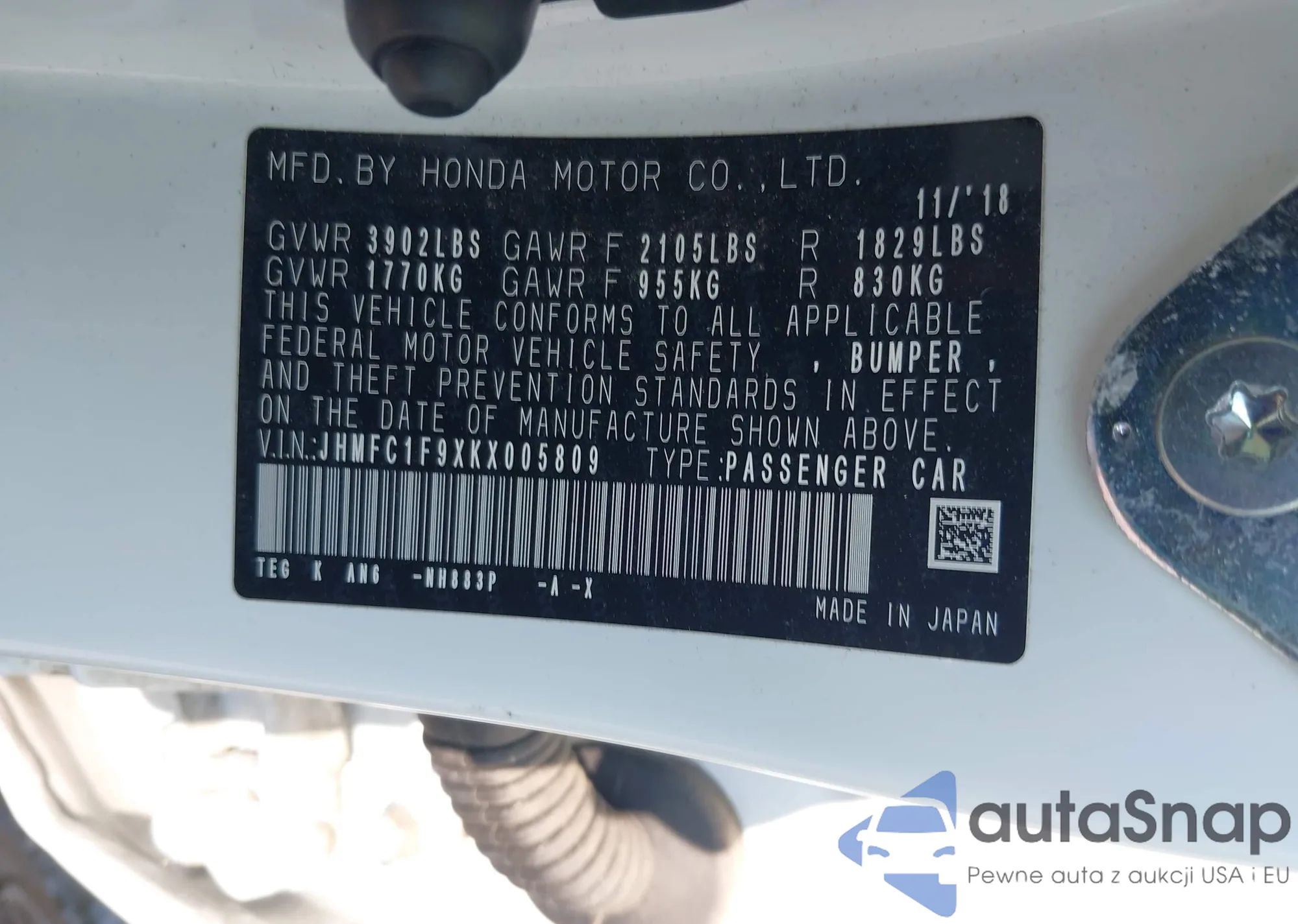 LOT: 42701669 VIN: JHMFC1F9XKX005809