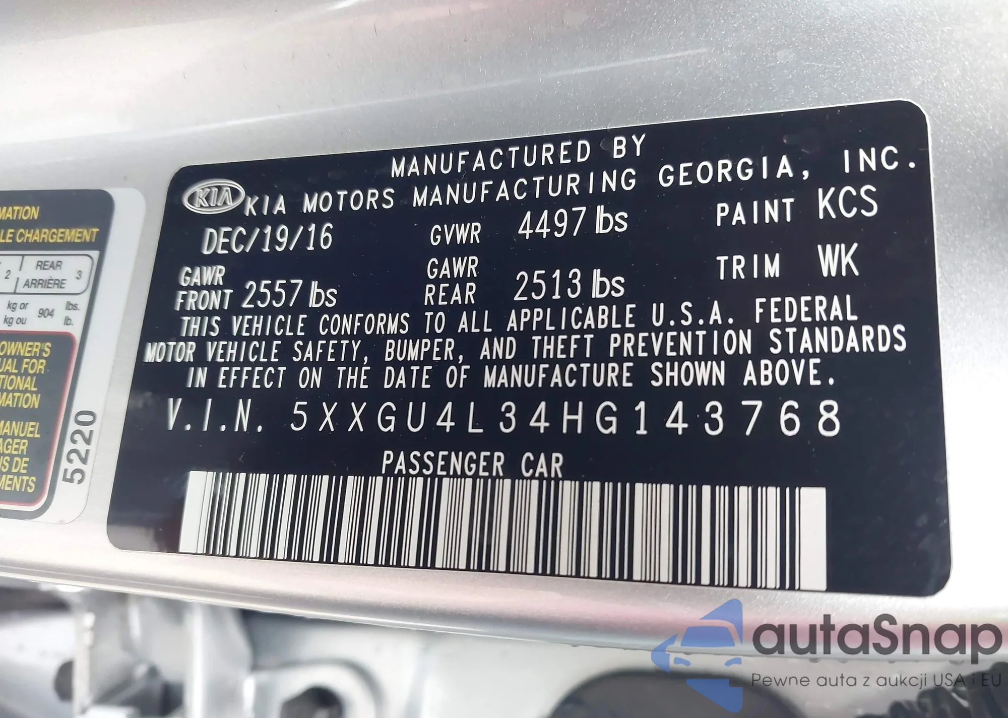 LOT: 43048168 VIN: 5XXGU4L34HG143768