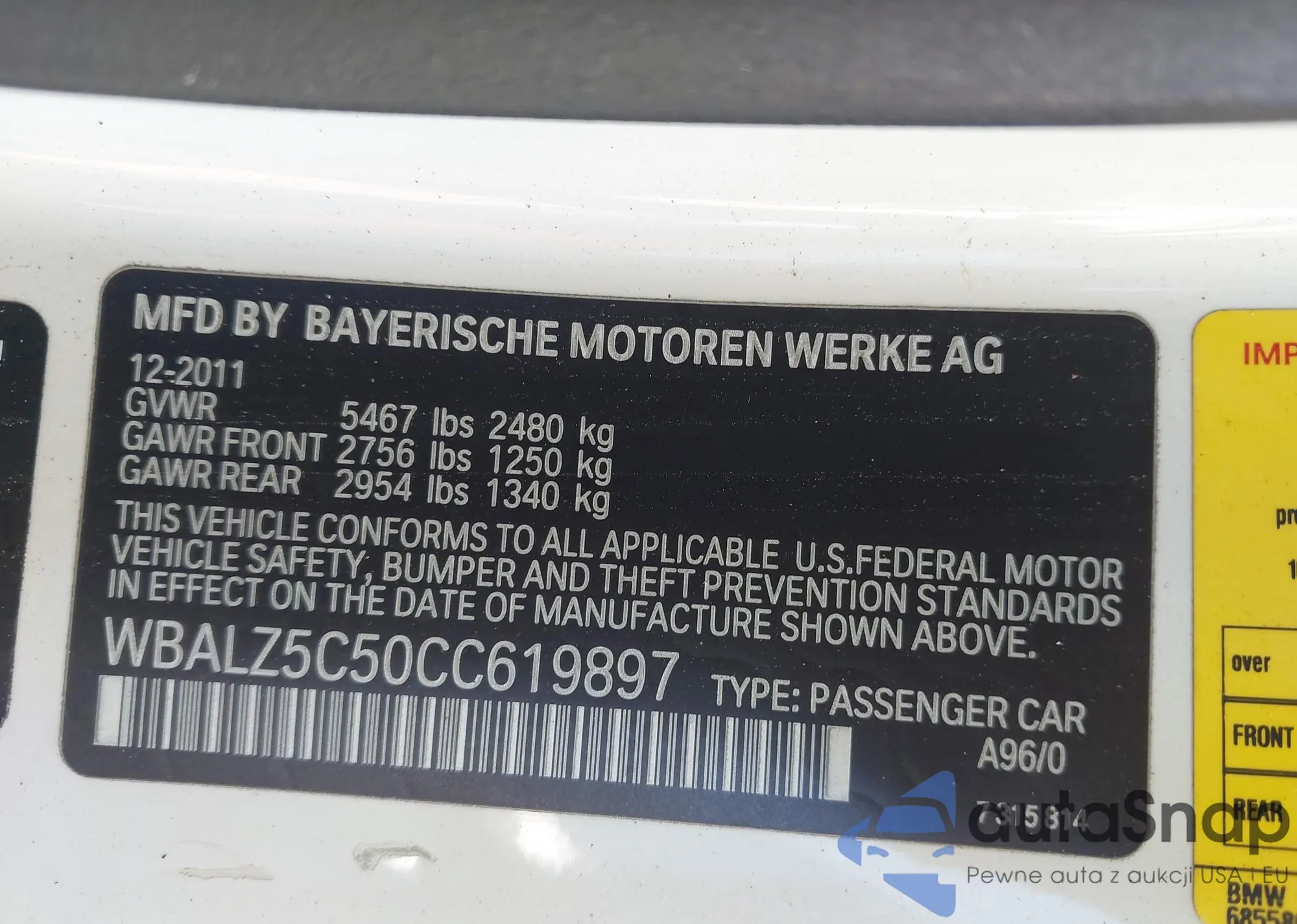 LOT: 43162953 VIN: WBALZ5C50CC619897