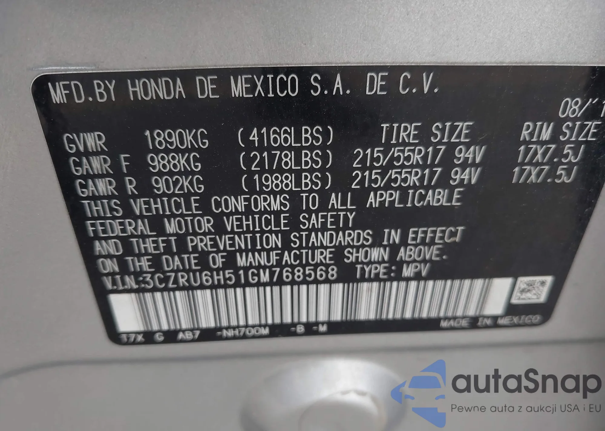 • VIN 3CZRU6H51GM768568