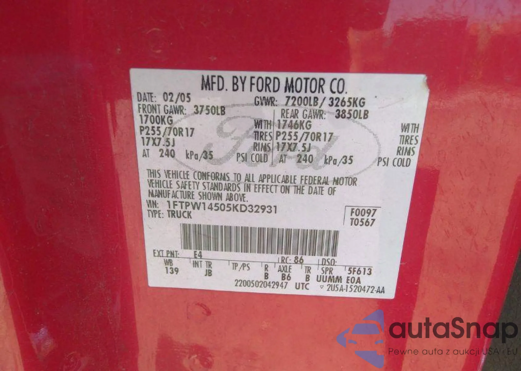 LOT: 37930265 VIN: 1FTPW14505KD32931
