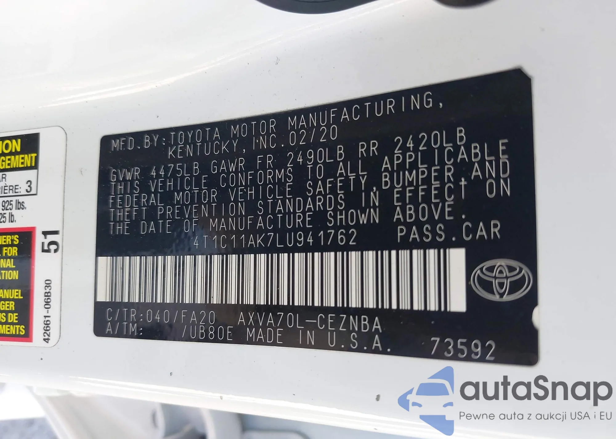 LOT: 43290996 VIN: 4T1C11AK7LU941762