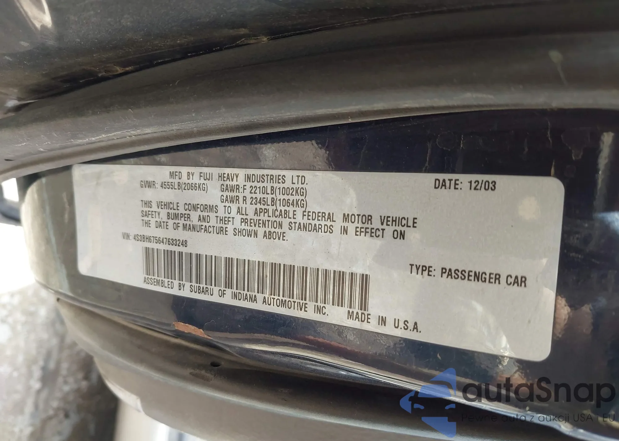 LOT: 43346875 VIN: 4S3BH675647633248