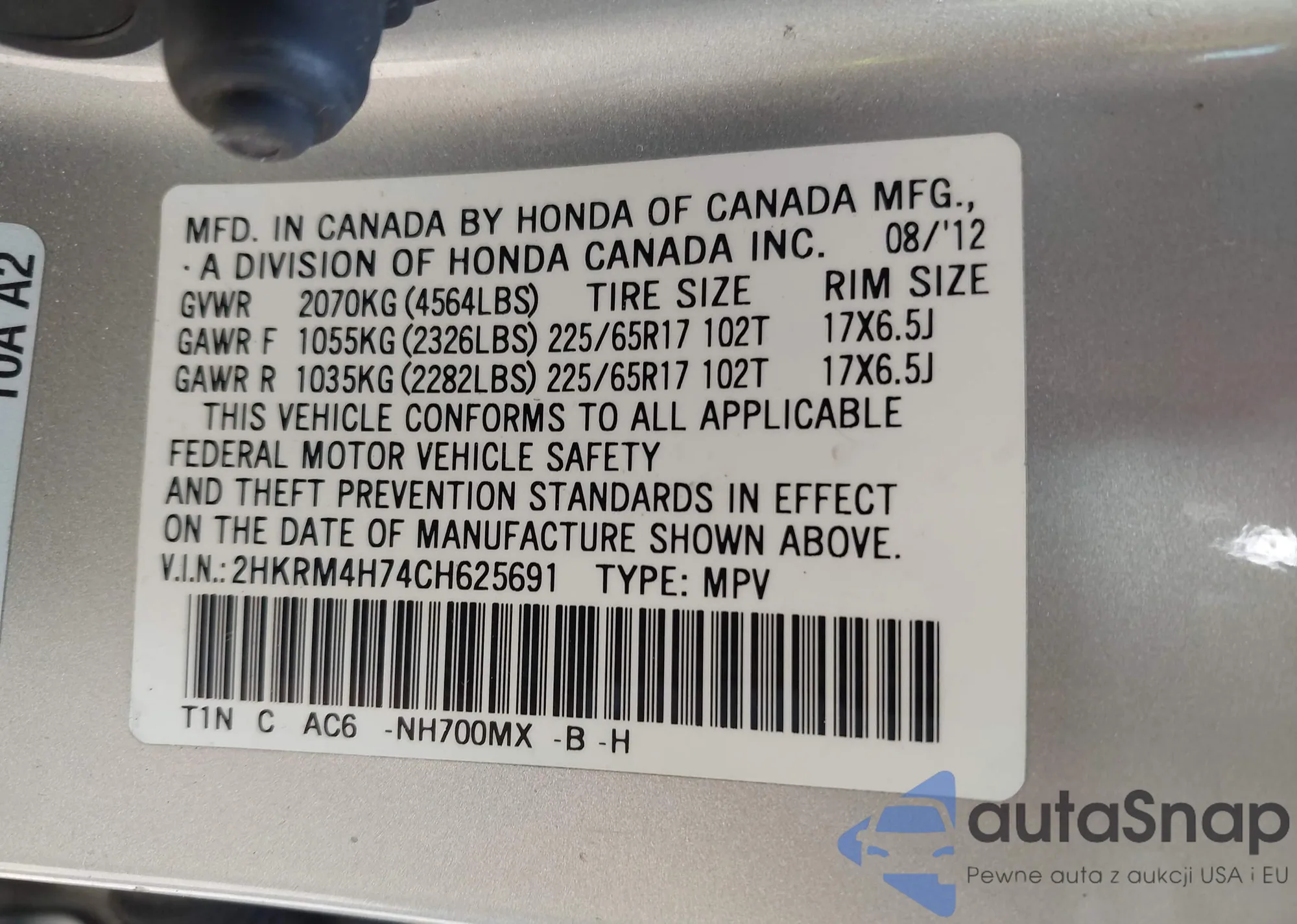• VIN 2HKRM4H74CH625691