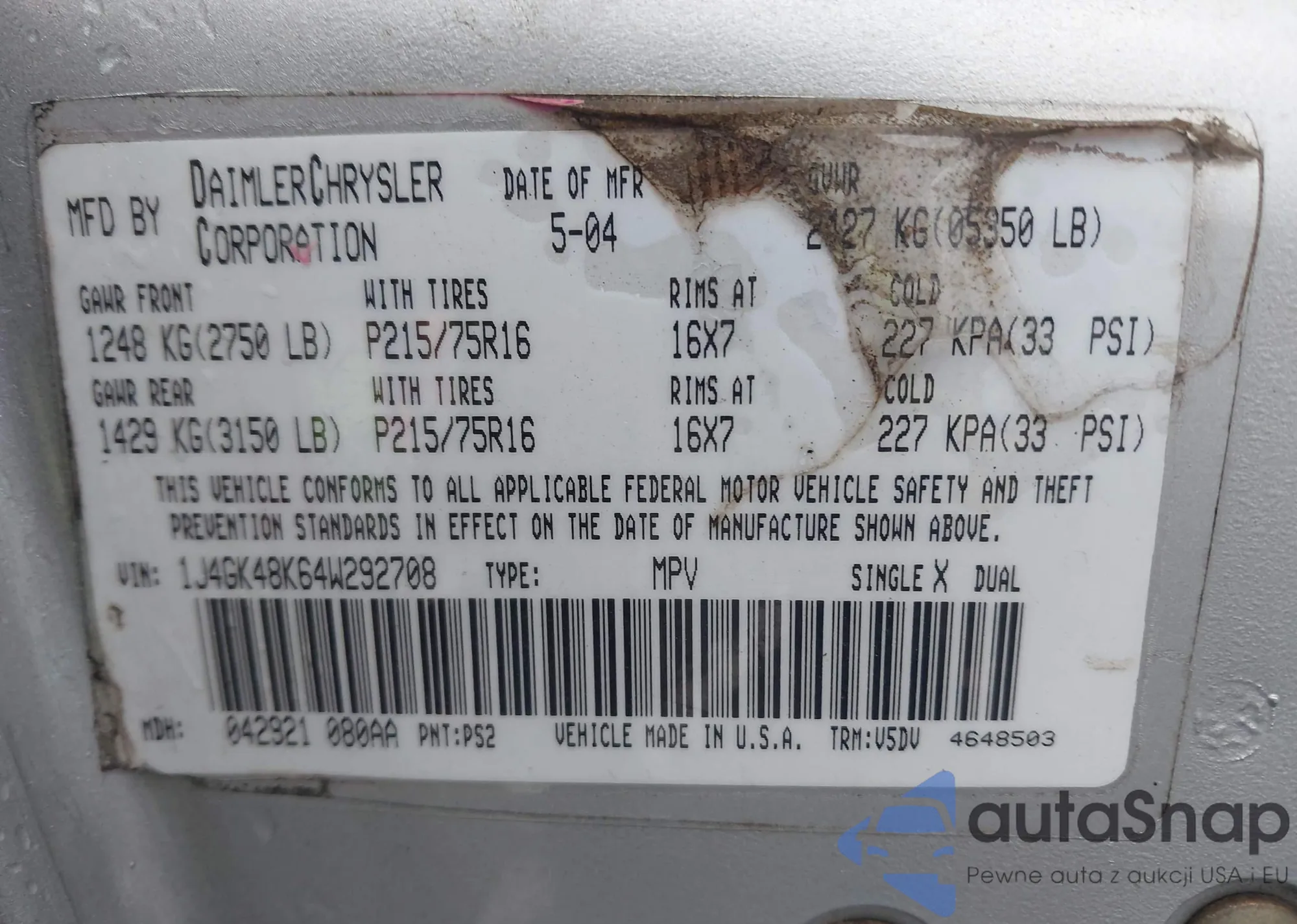 LOT: 43202704 VIN: 1J4GK48K64W292708