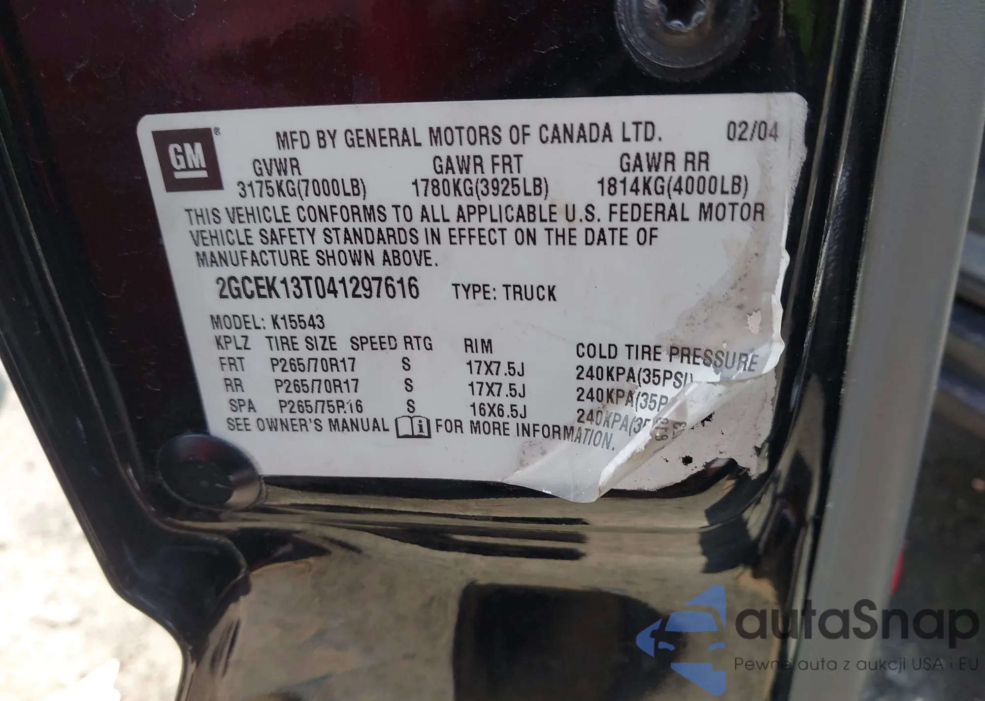 • VIN 2GCEK13T041297616
