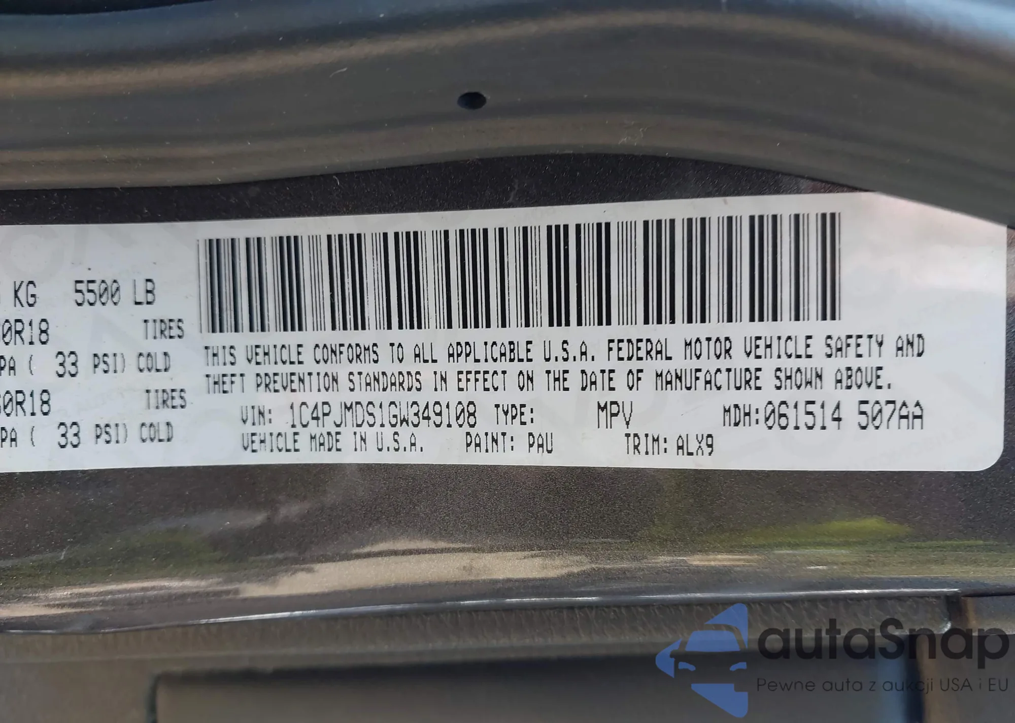 LOT: 43102374 VIN: 1C4PJMDS1GW349108