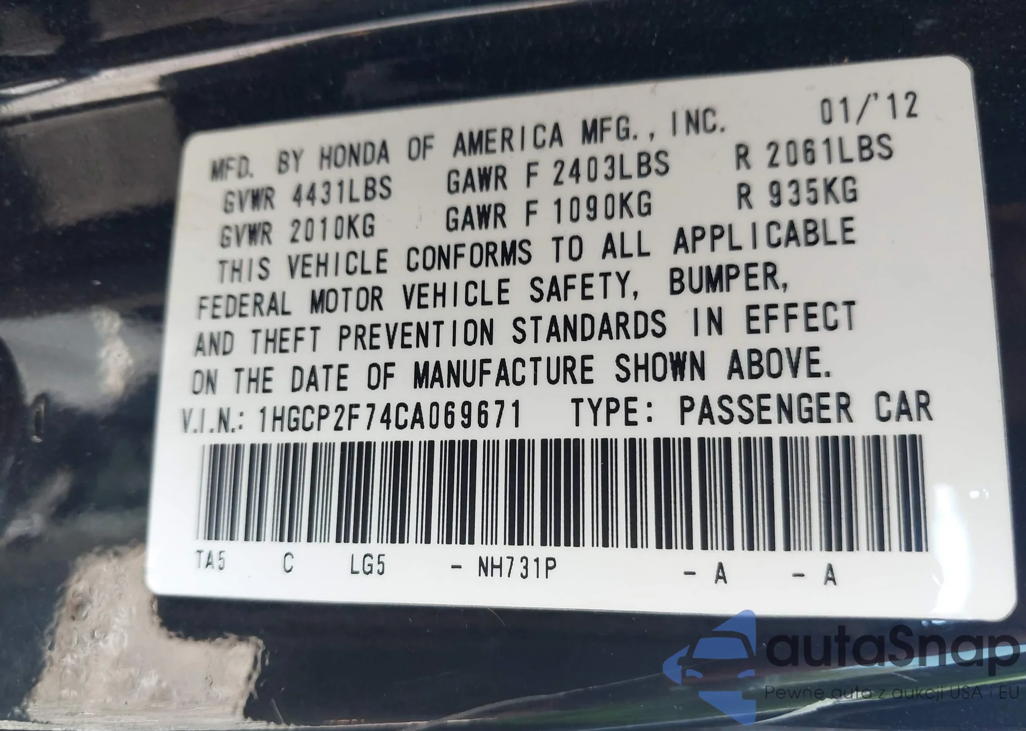 • VIN 1HGCP2F74CA069671