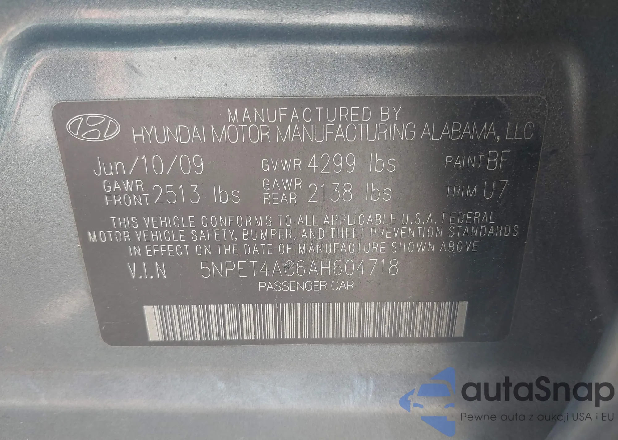 • VIN 5NPET4AC6AH604718