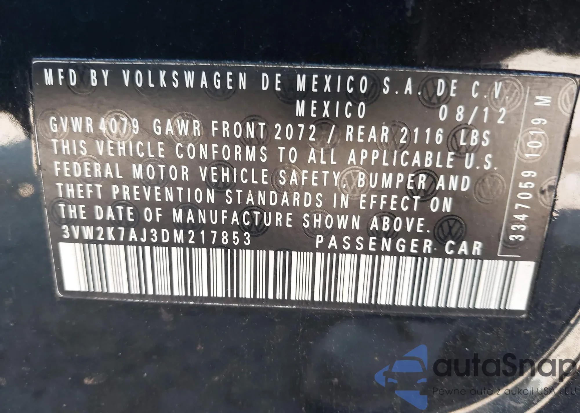 • VIN 3VW2K7AJ3DM217853