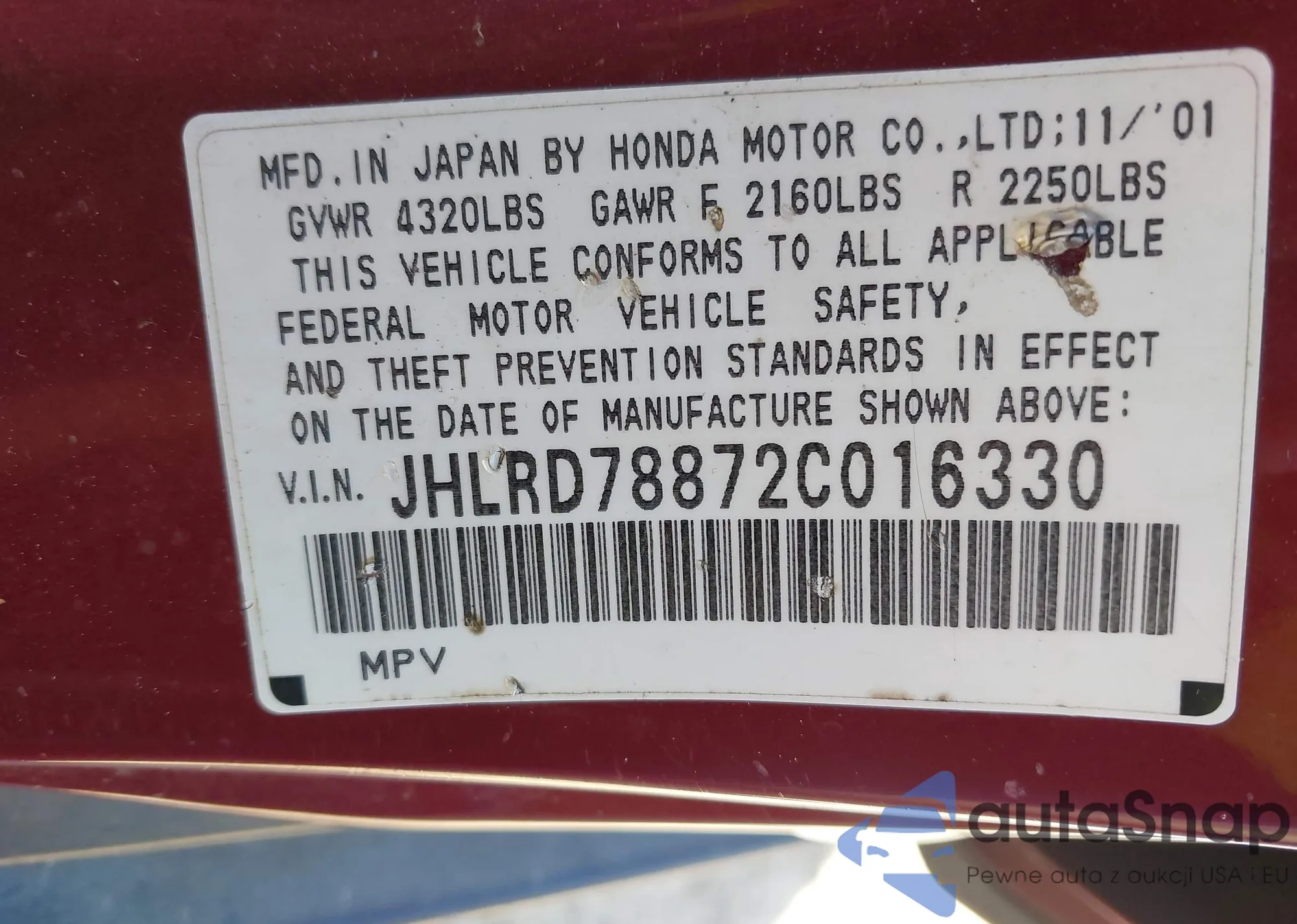 LOT: 43111942 VIN: 1HGCP2F74CA069671