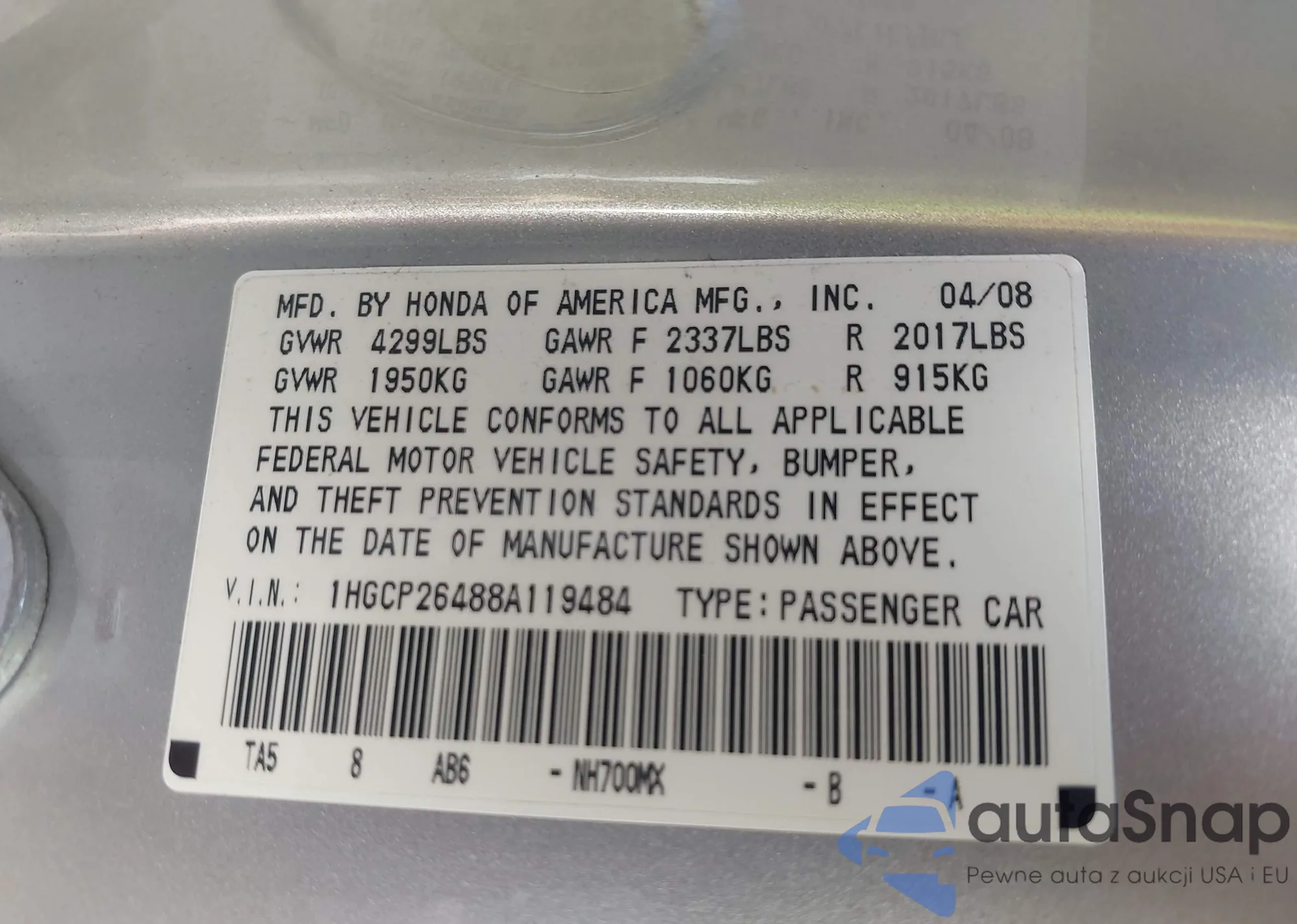LOT: 43190503 VIN: 1HGCP26488A119484