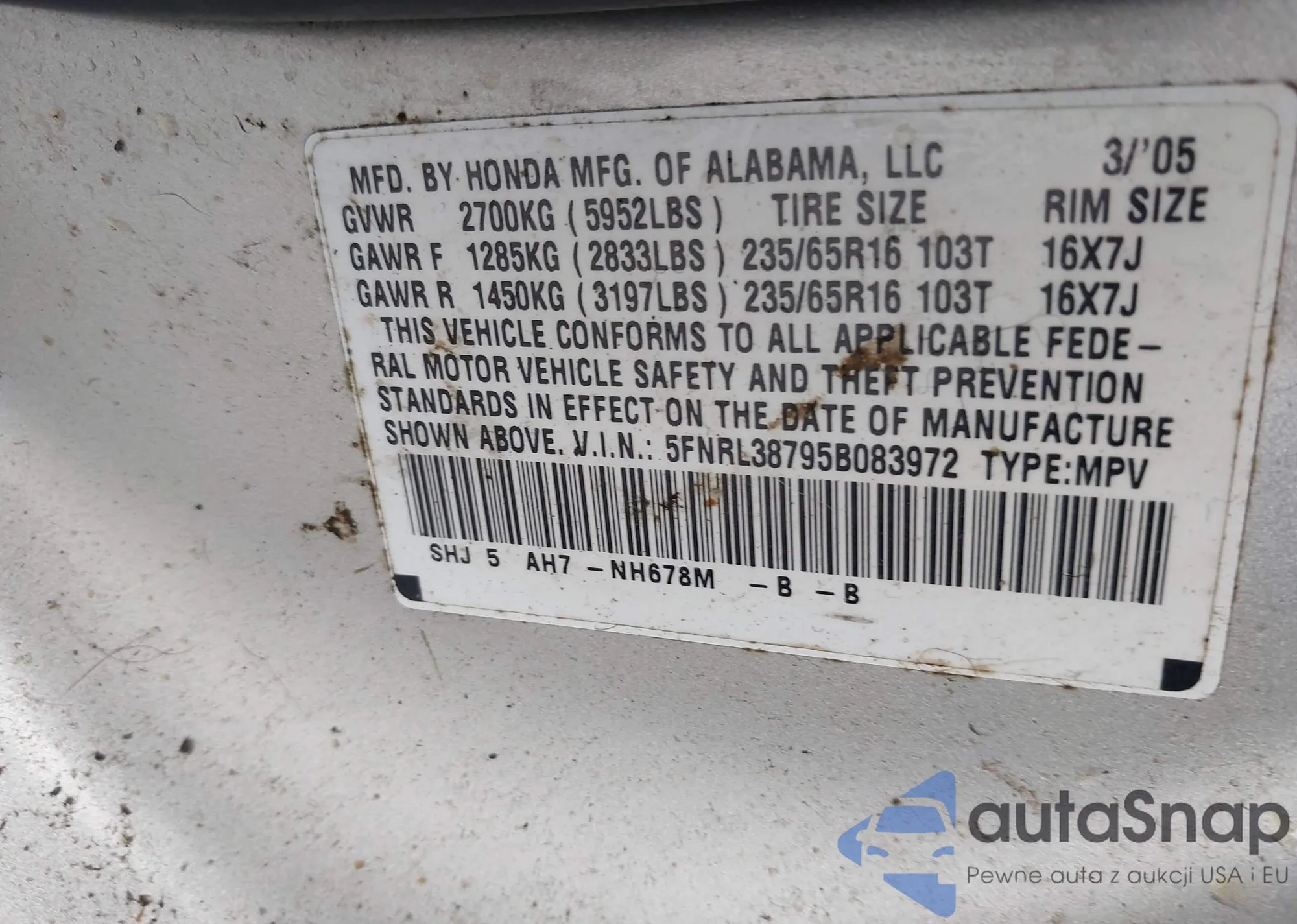 LOT: 43178233 VIN: 5FNRL38795B083972