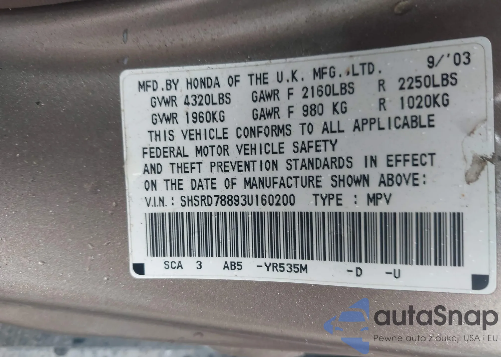 LOT: 43033615 VIN: SHSRD78893U160200