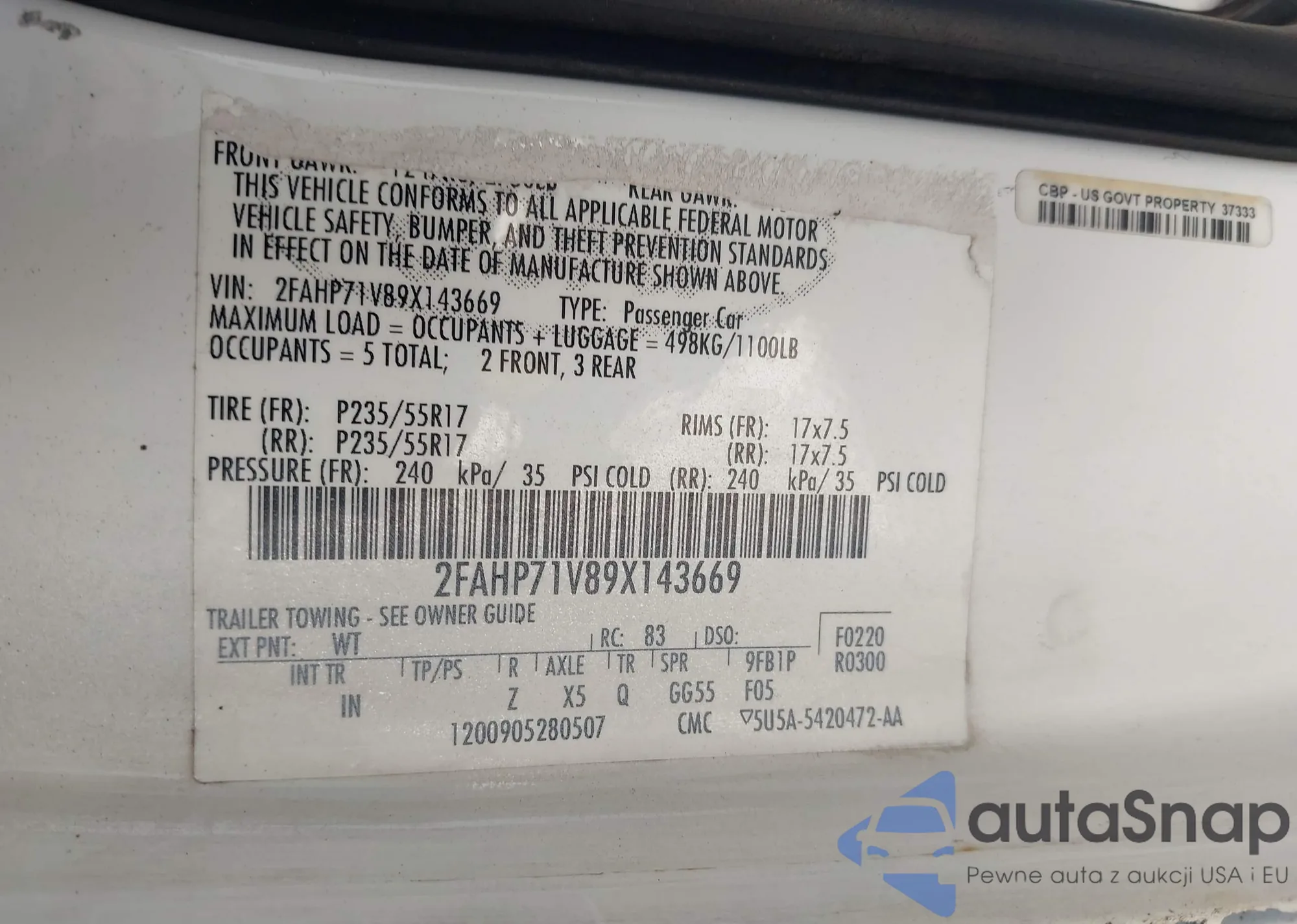 LOT: 43328977 VIN: 2FAHP71V89X143669