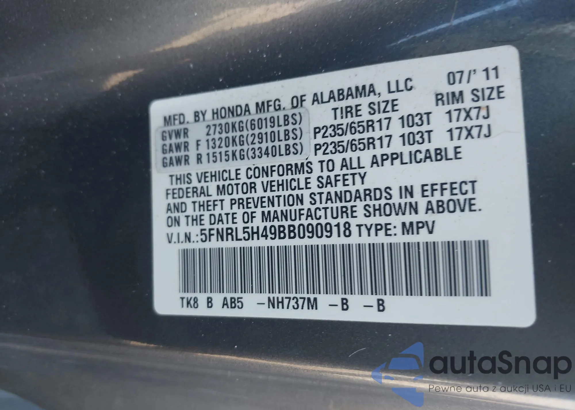 • VIN 5FNRL5H49BB090918