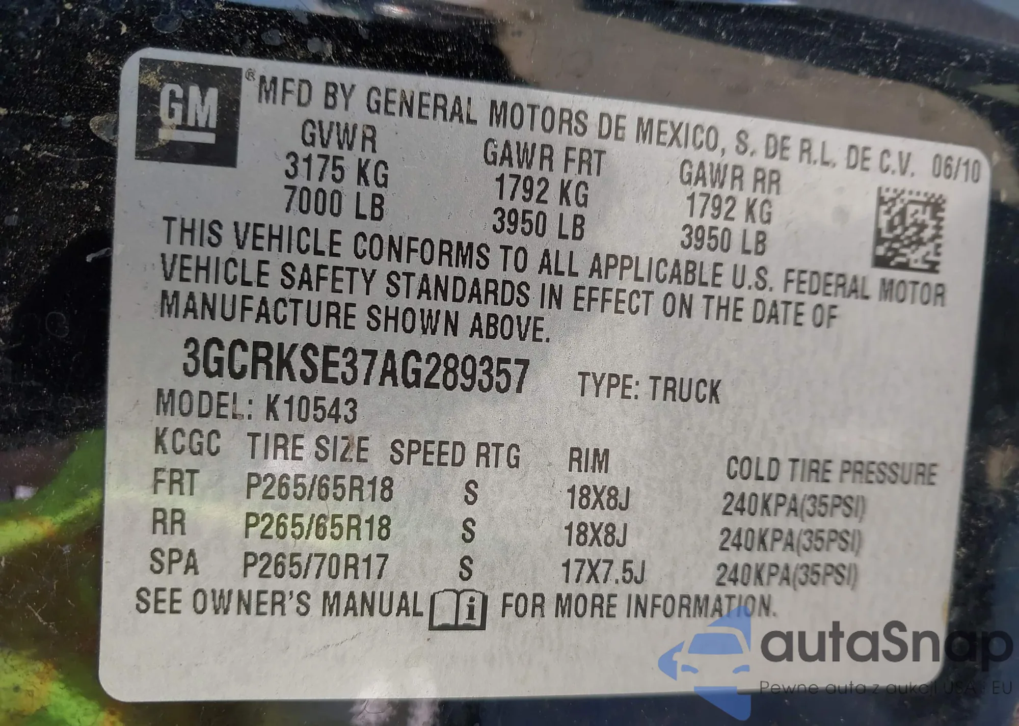 • VIN 3GCRKSE37AG289357