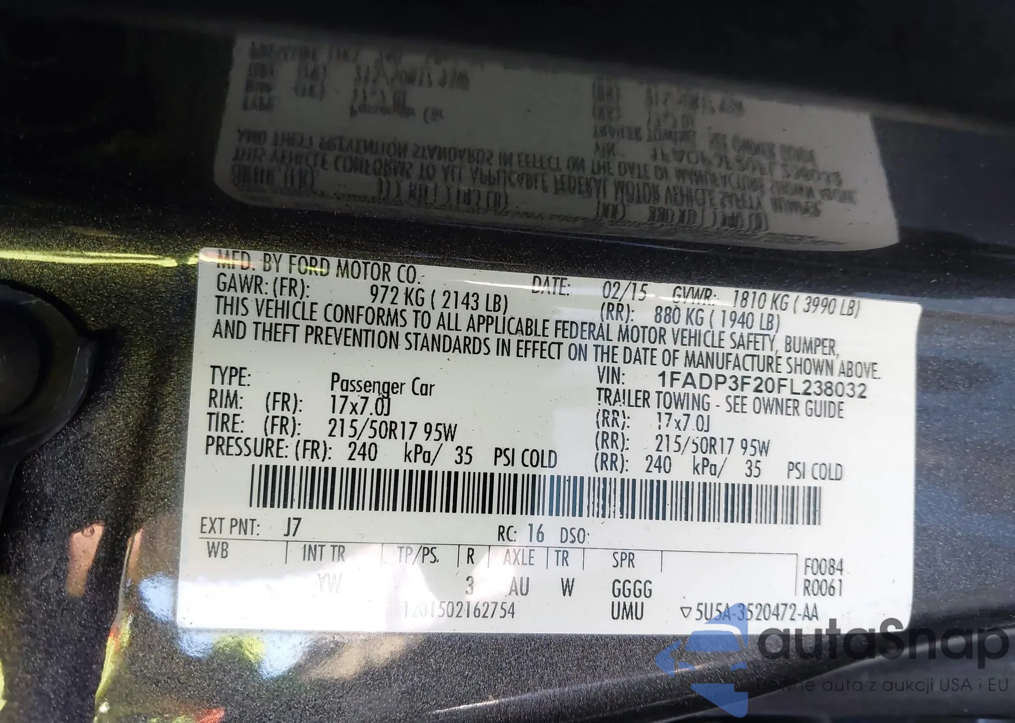 LOT: 43094036 VIN: 1FADP3F20FL238032