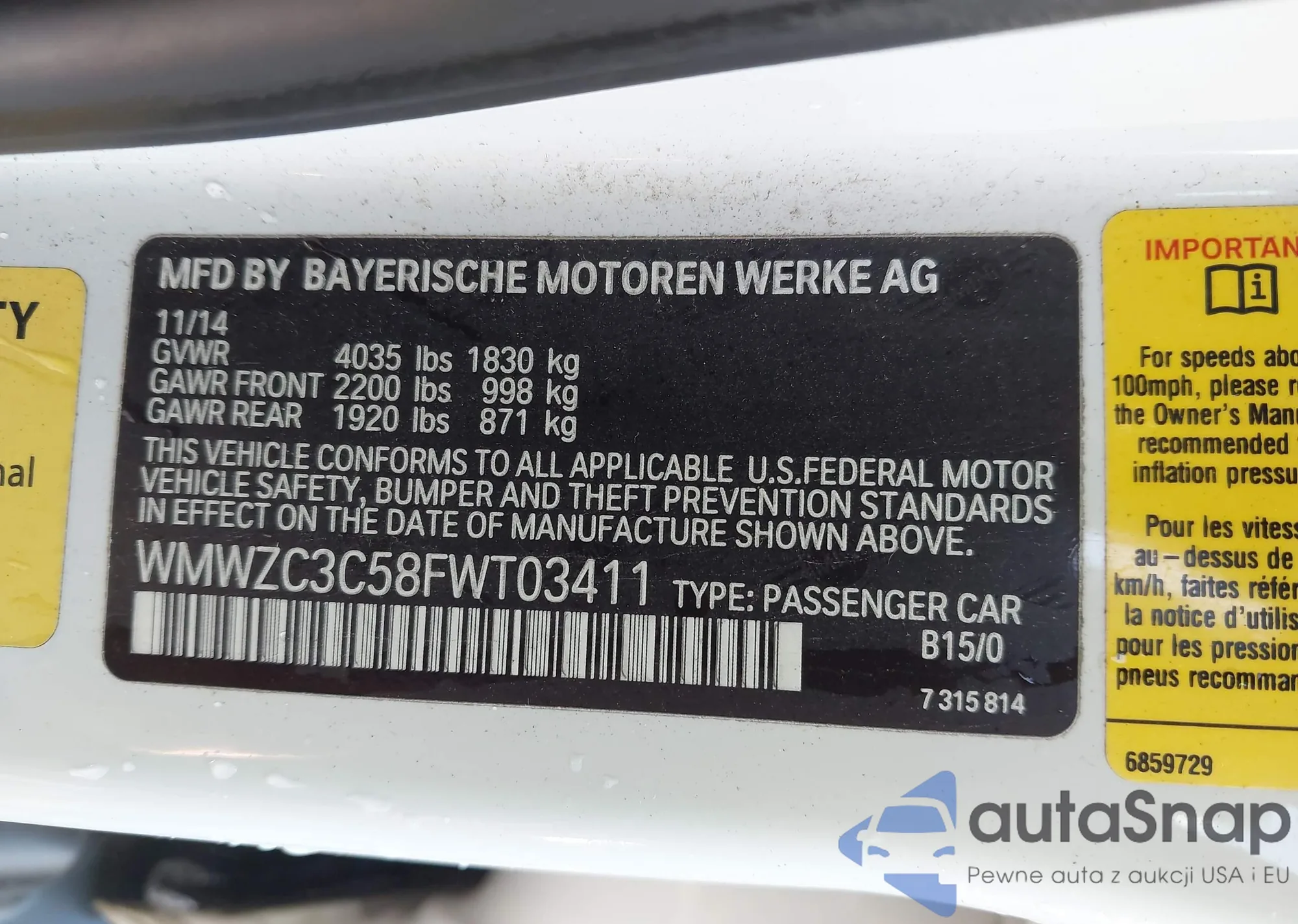 LOT: 43163120 VIN: WMWZC3C58FWT03411