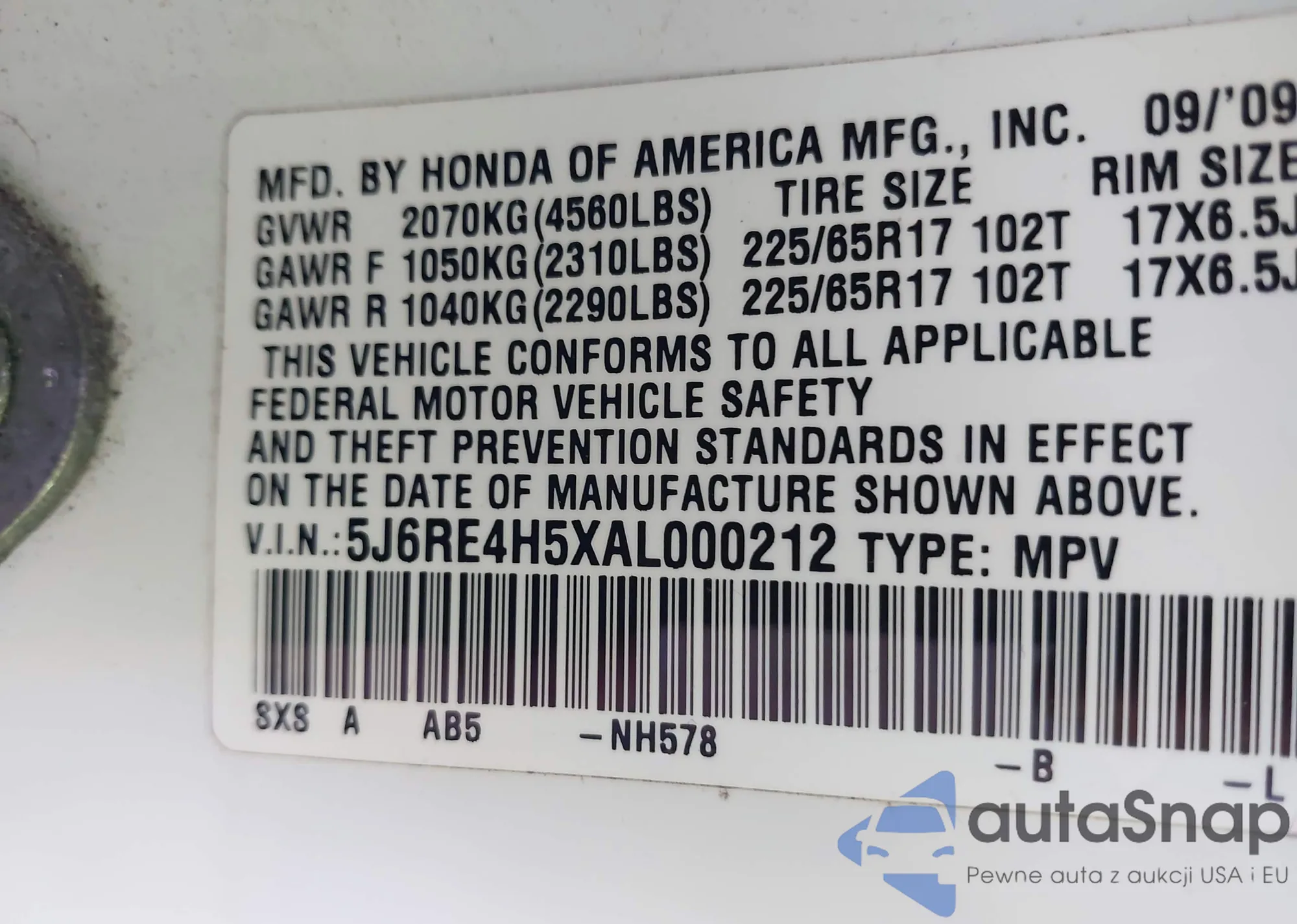 • VIN 5J6RE4H5XAL000212