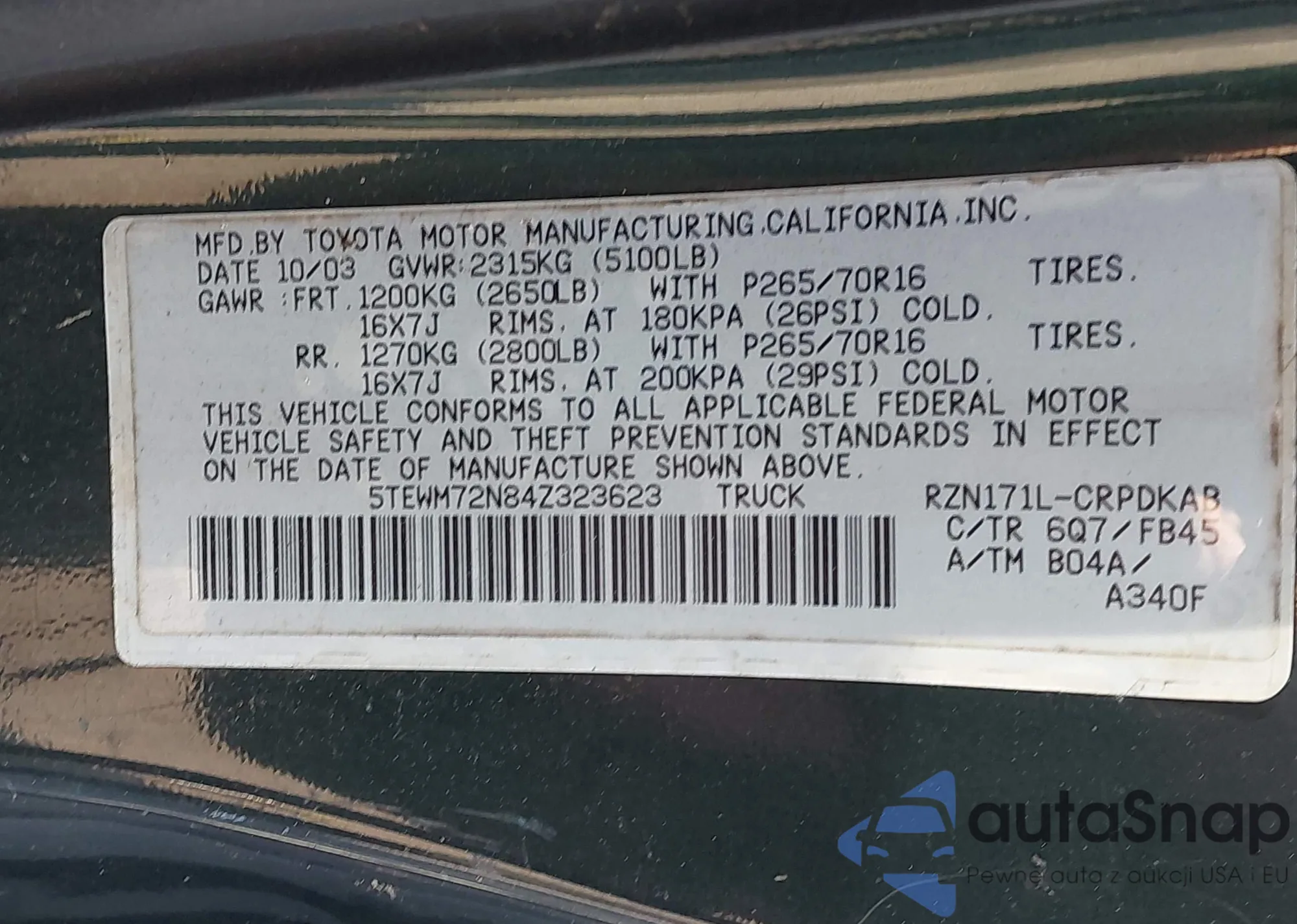 LOT: 43211373 VIN: 5TEWM72N84Z323623