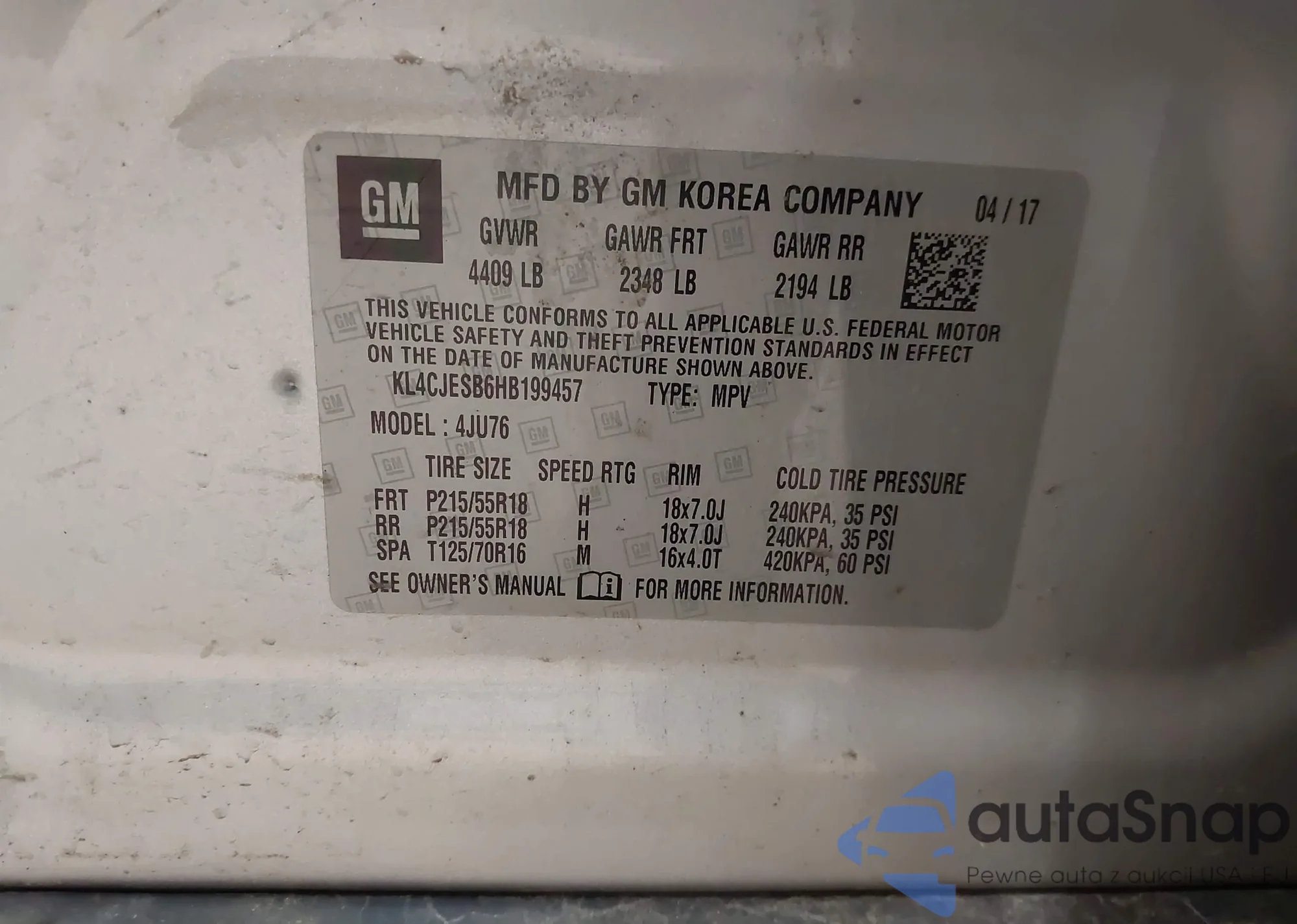 • VIN KL4CJESB6HB199457