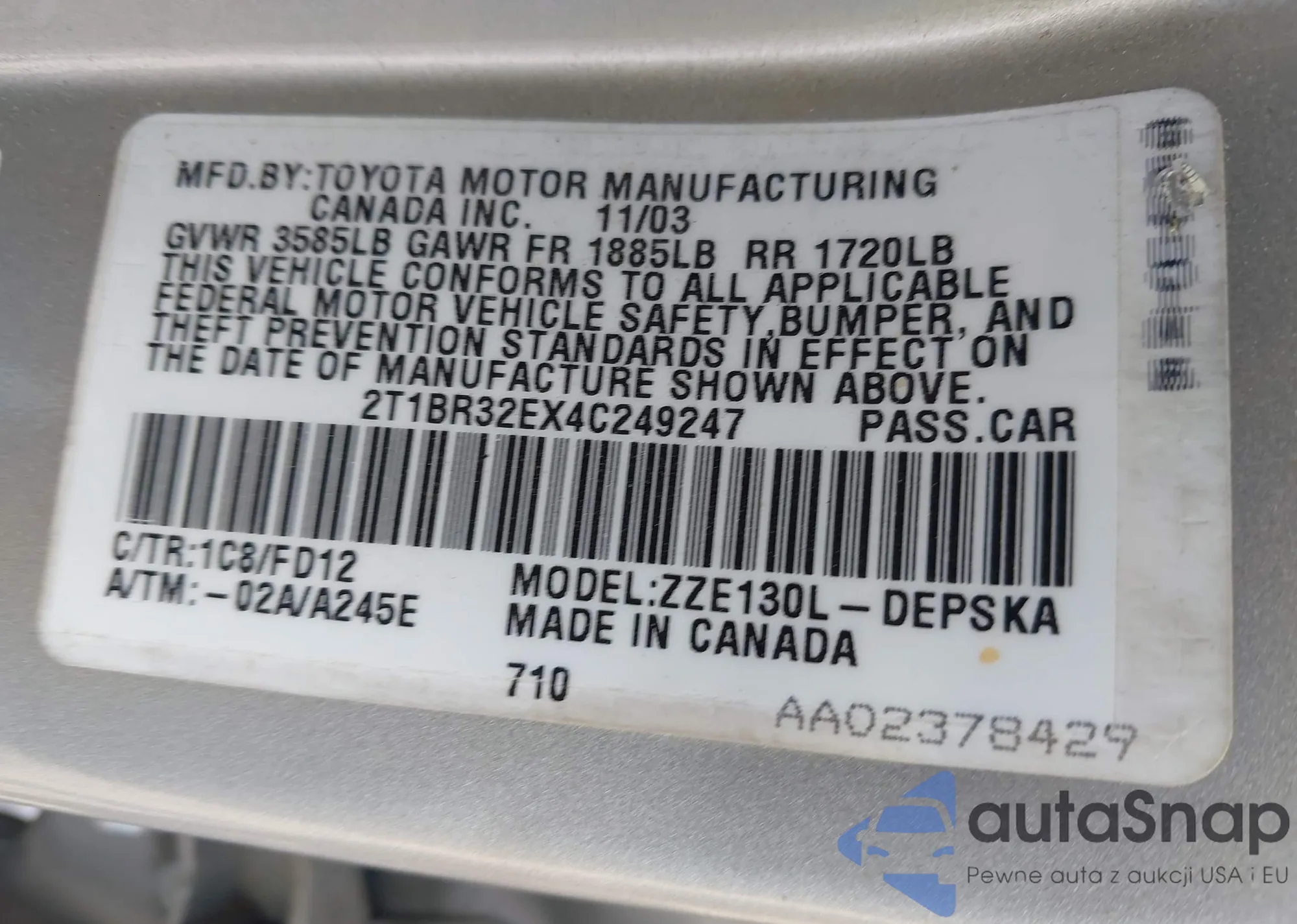 • VIN 2T2ZZMCA2JC111967