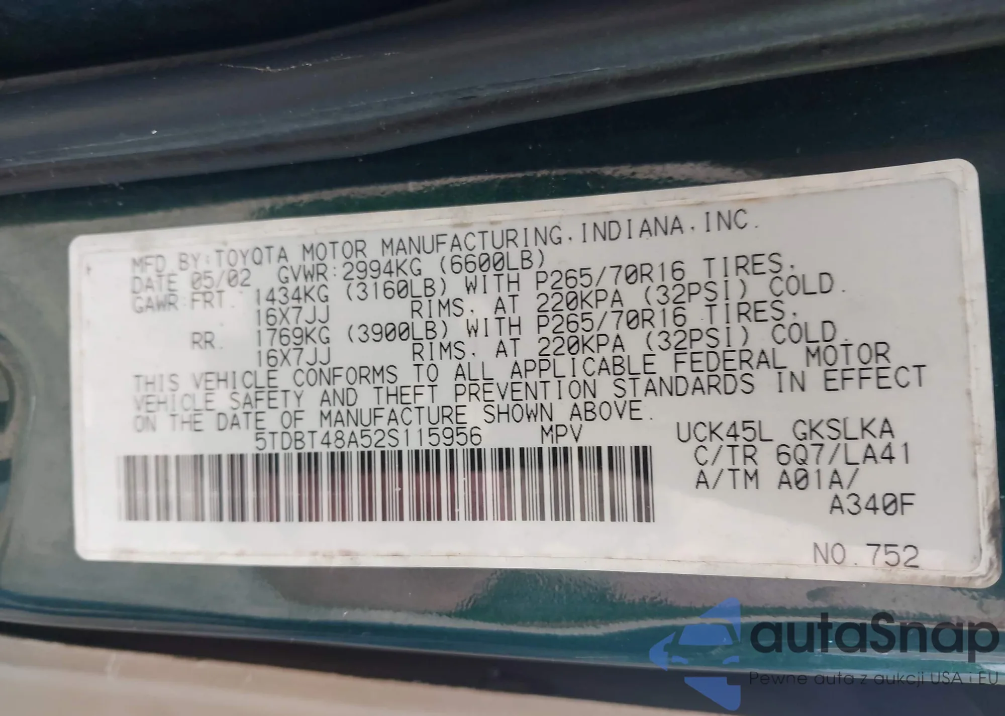 LOT: 43162282 VIN: 5TDBT48A52S115956
