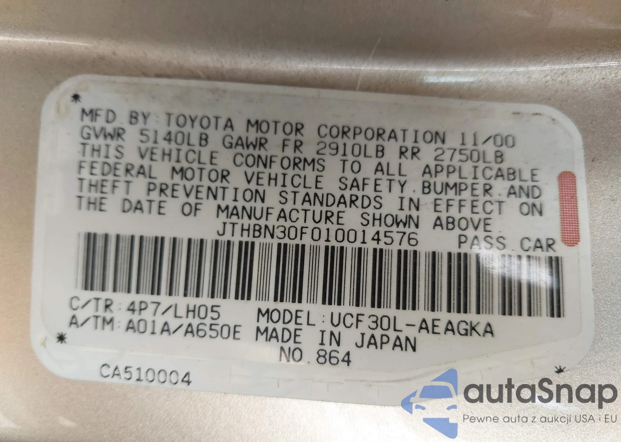 LOT: 42806484 VIN: JTHBN30F010014576