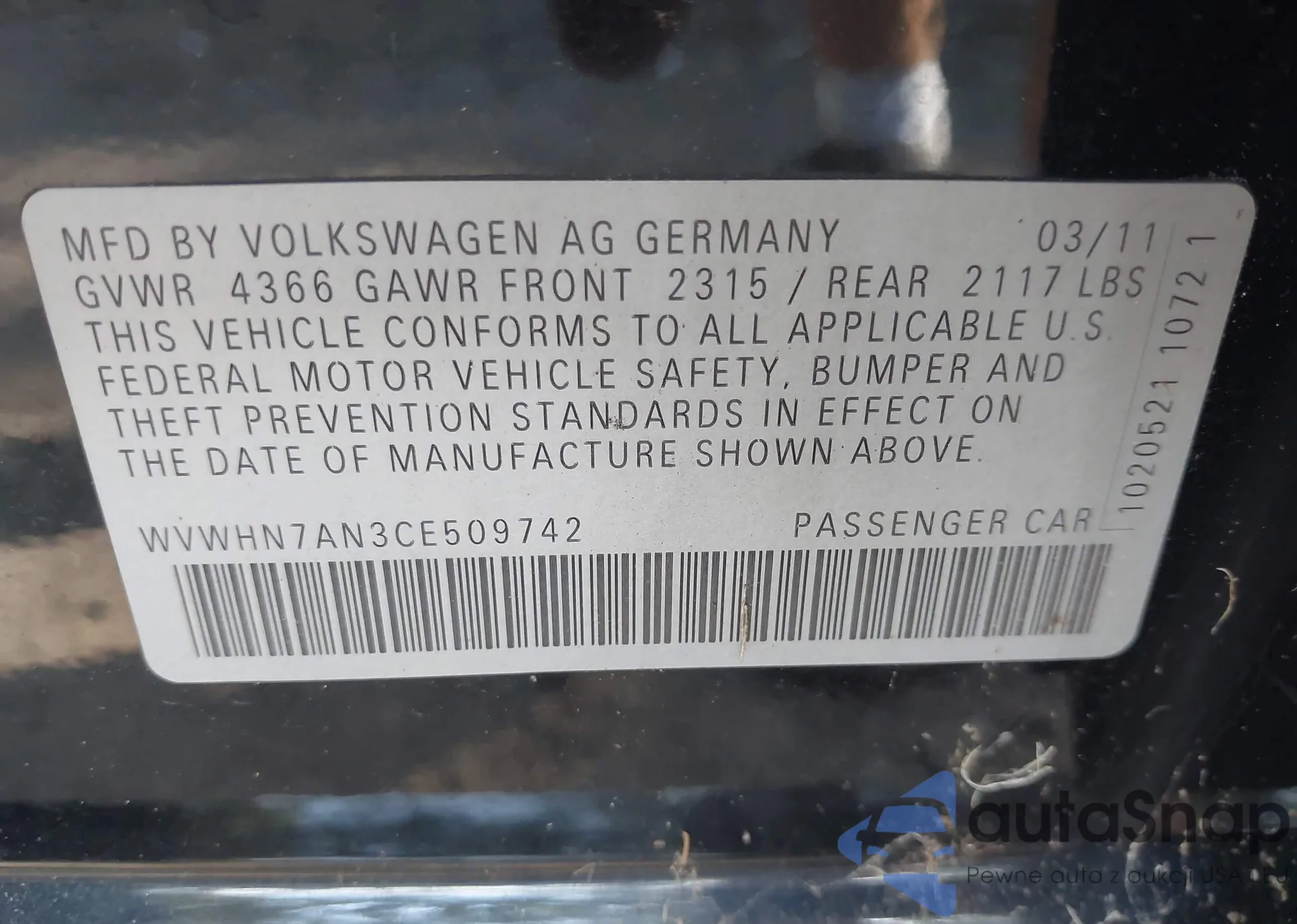 • VIN WVWHN7AN3CE509742