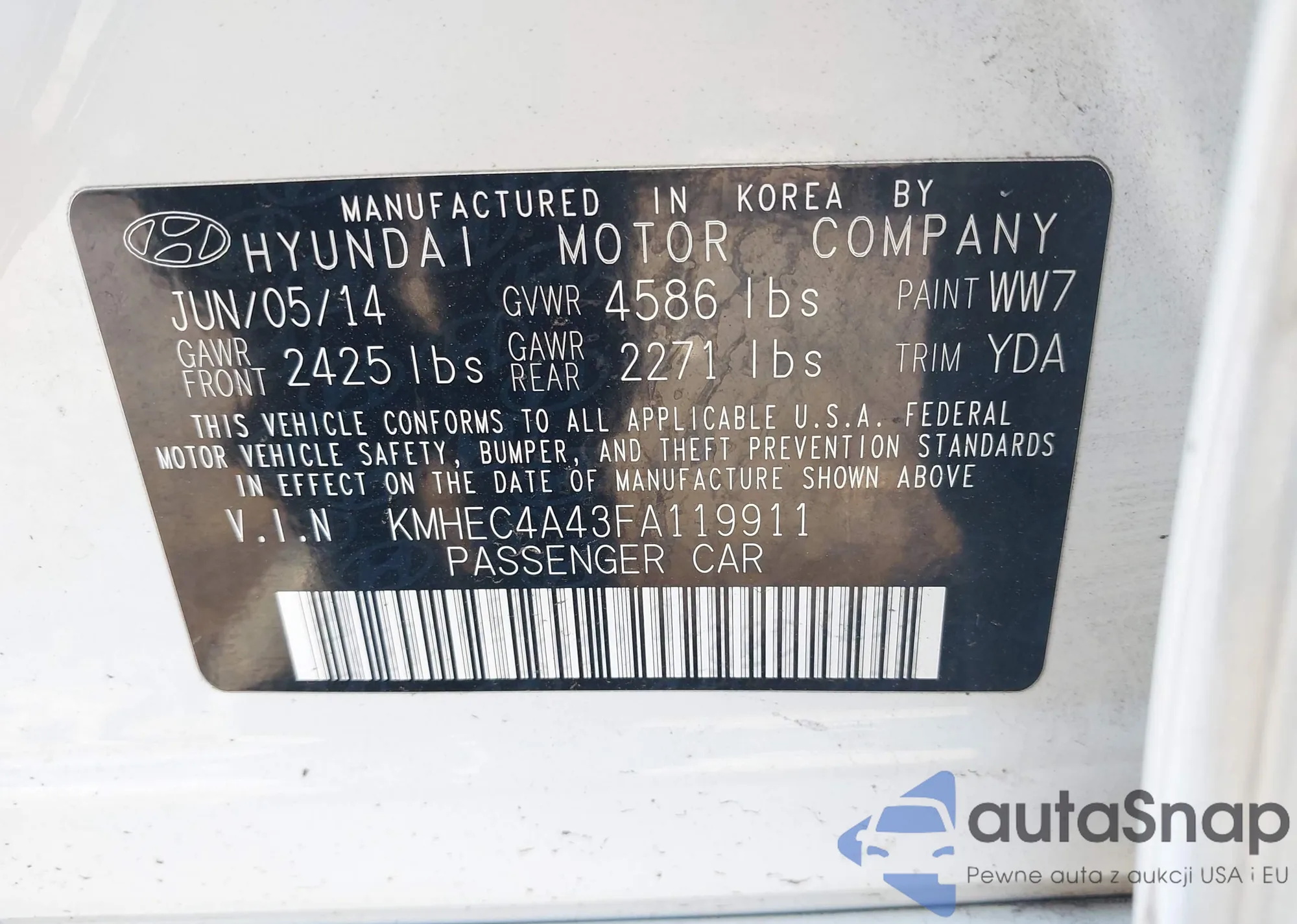 LOT: 43139496 VIN: KMHEC4A43FA119911