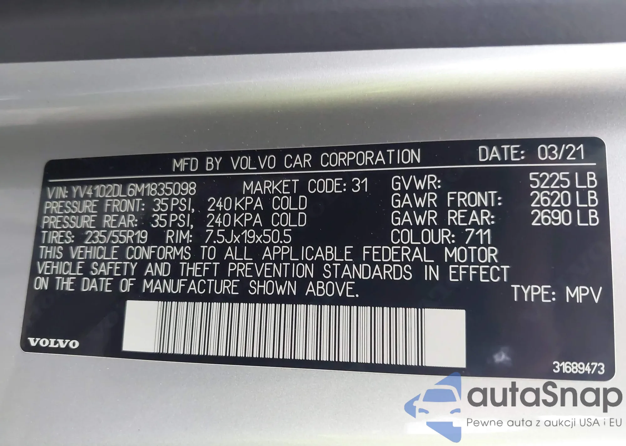 LOT: 43167847 VIN: YV4102DL6M1835098