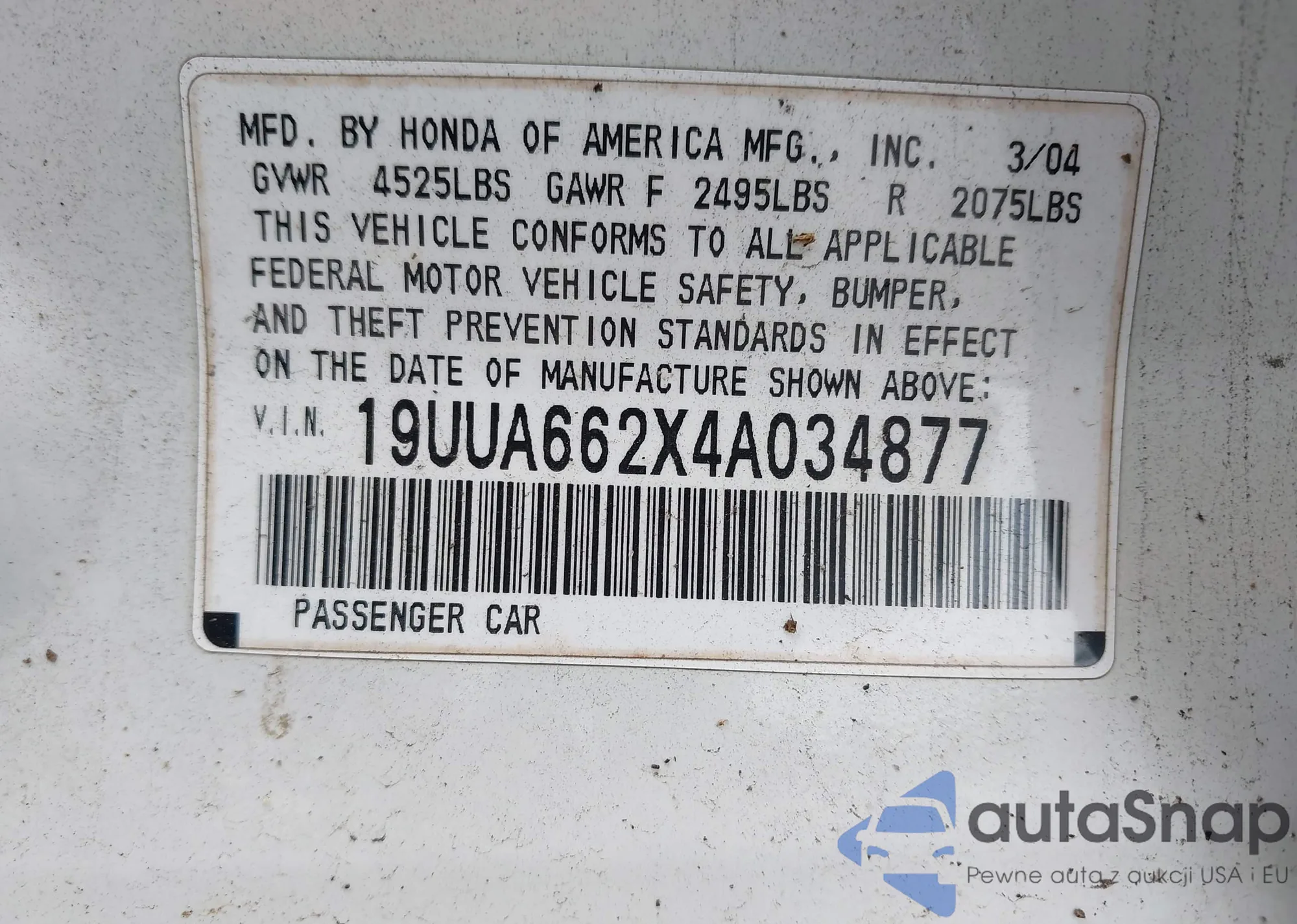• VIN 19UUA662X4A034877