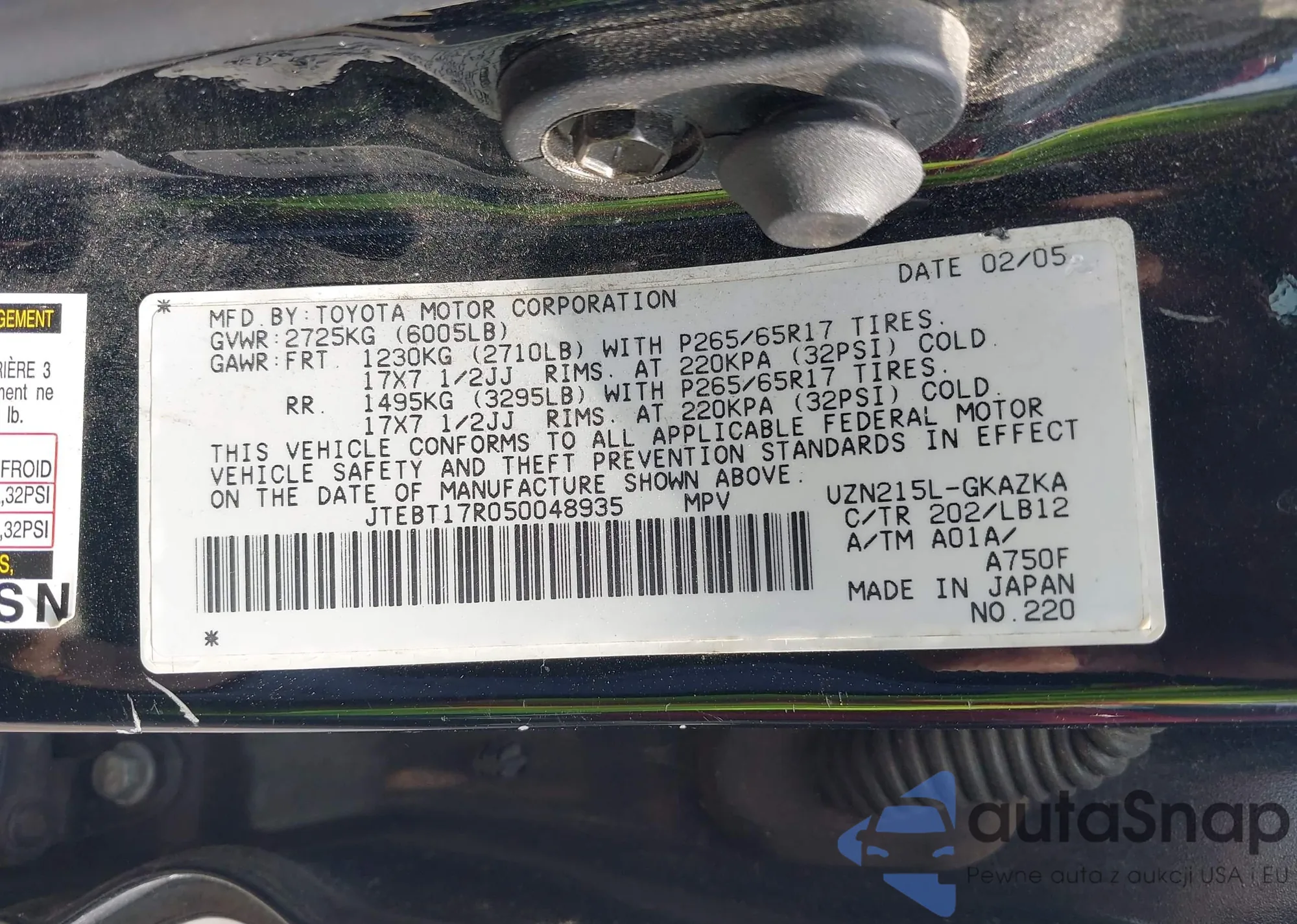 LOT: 43146458 VIN: JTEBT17R050048935