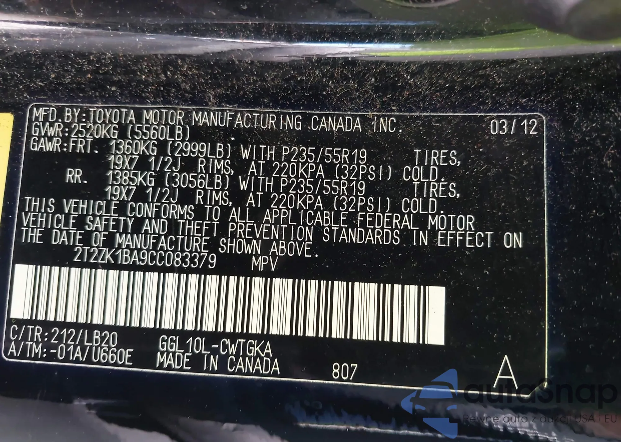 • VIN 2T2ZK1BA9CC083379