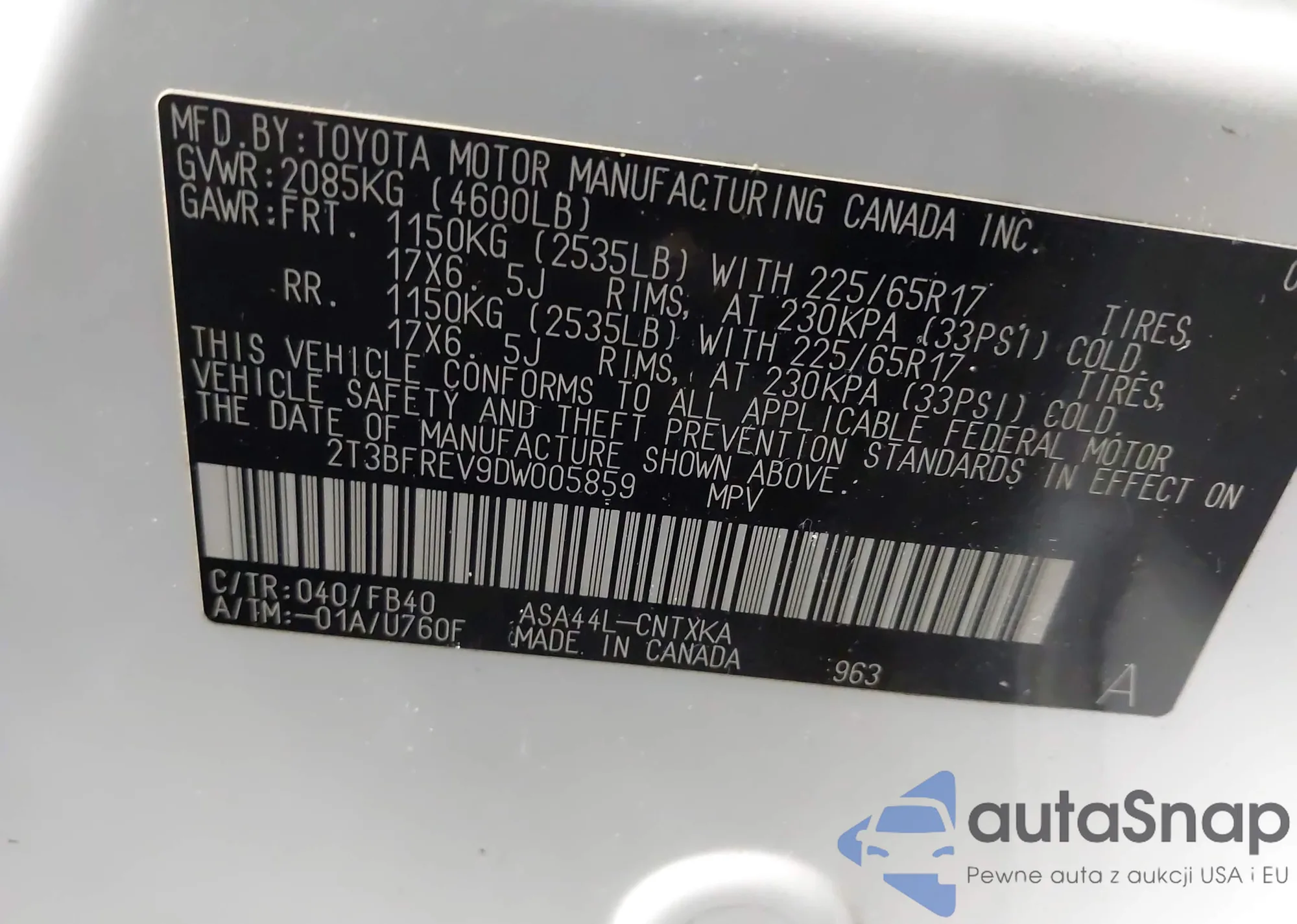 LOT: 43308694 VIN: 2T3BFREV9DW005859