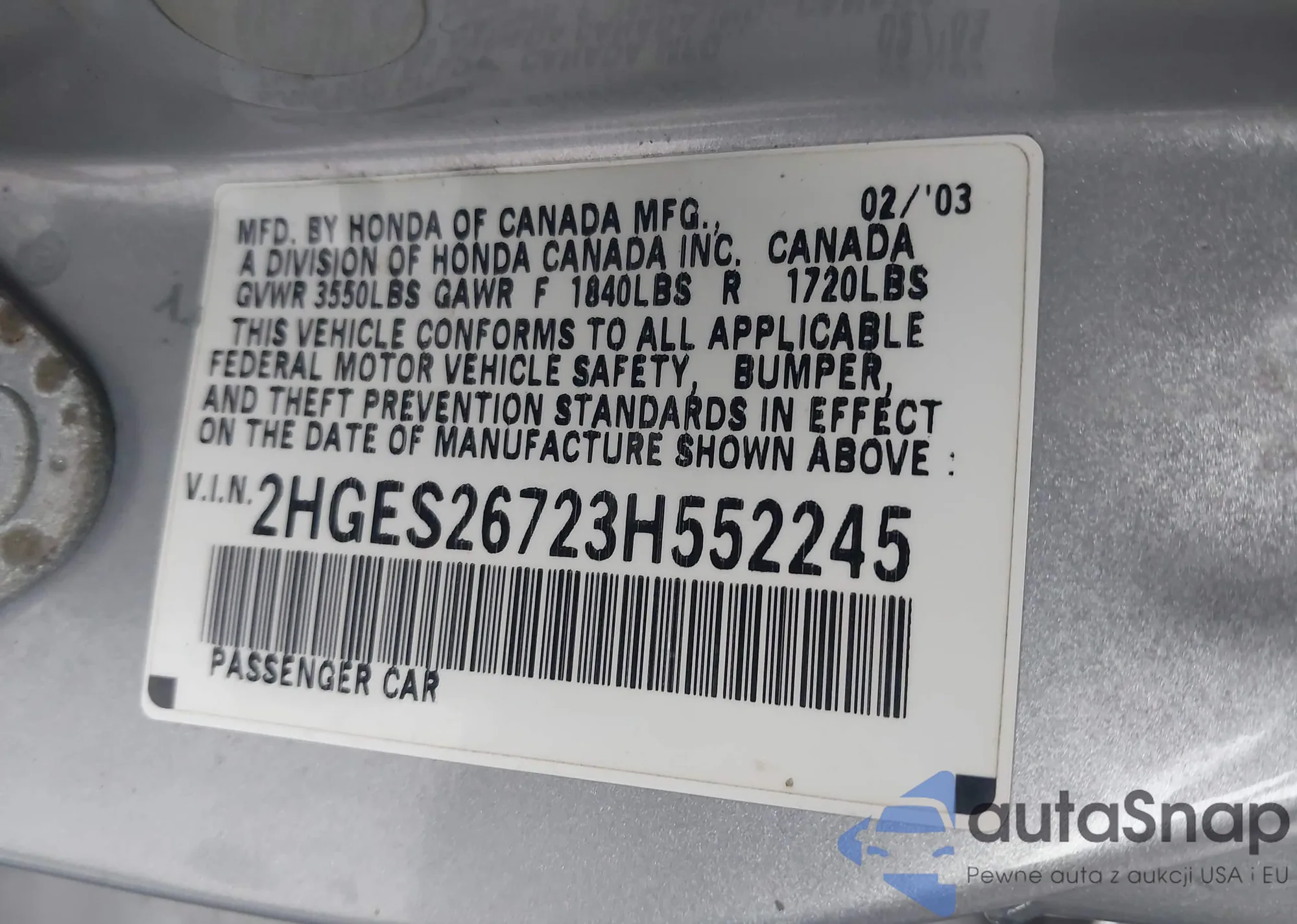 LOT: 43019614 VIN: 2HGES26723H552245