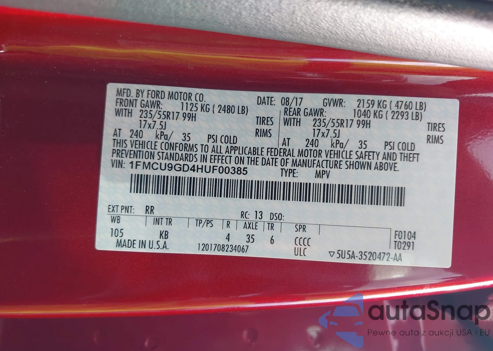 LOT: 43116339 VIN: 1FMCU9GD4HUF00385