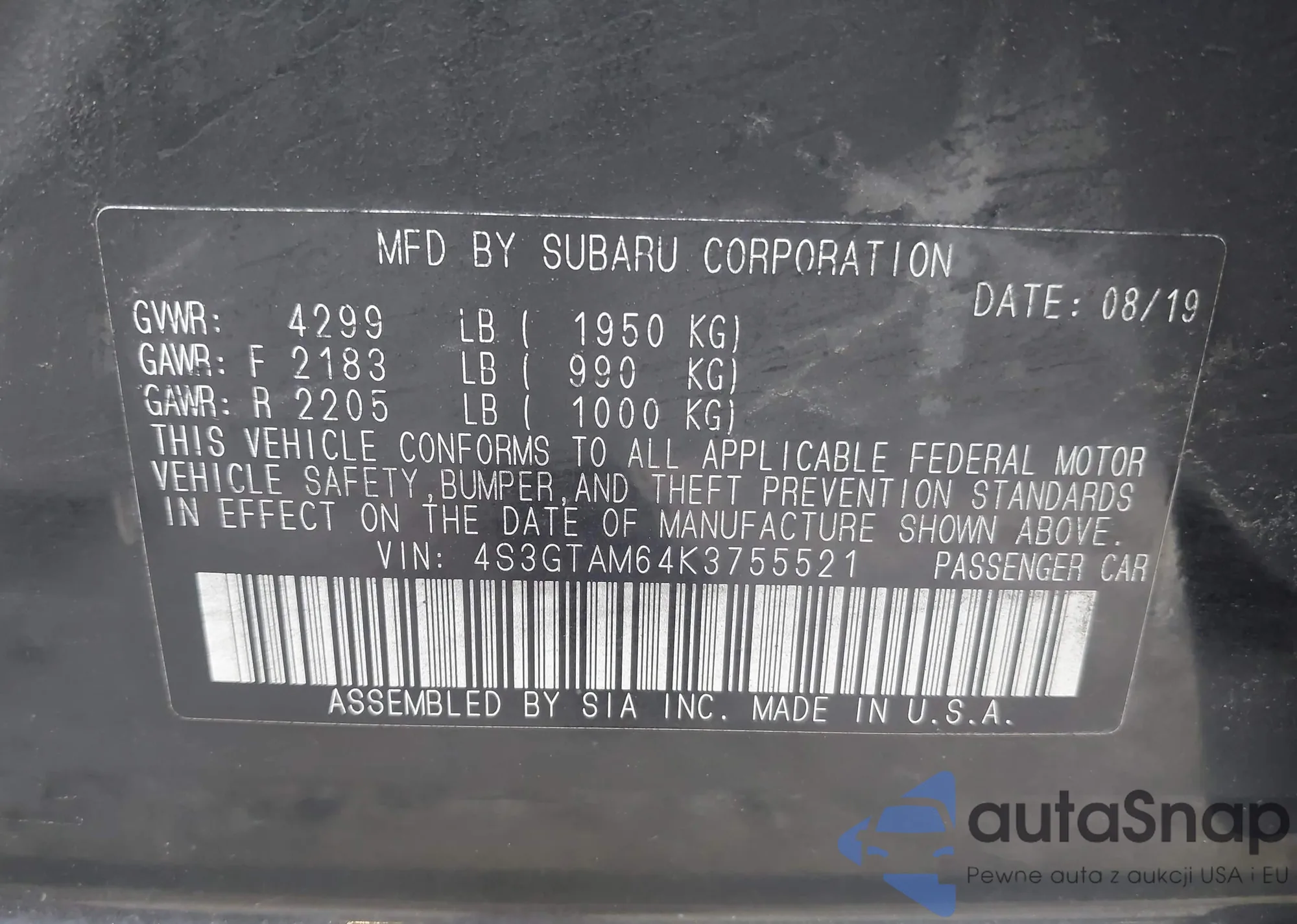 • VIN 4S3GTAM64K3755521