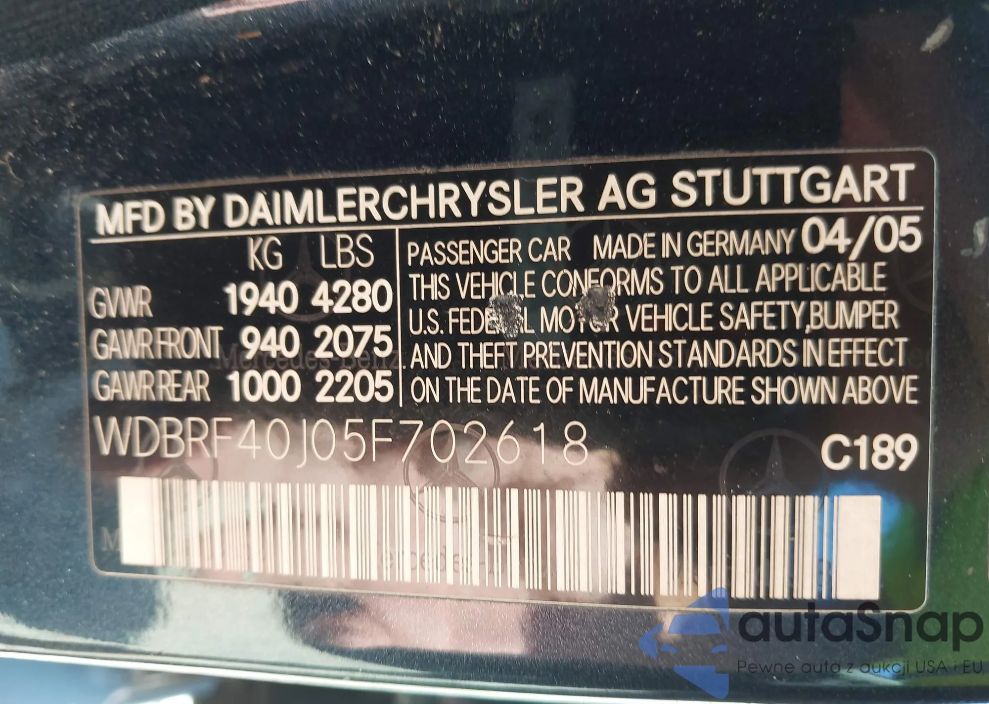 • VIN WDBRF40J05F702618