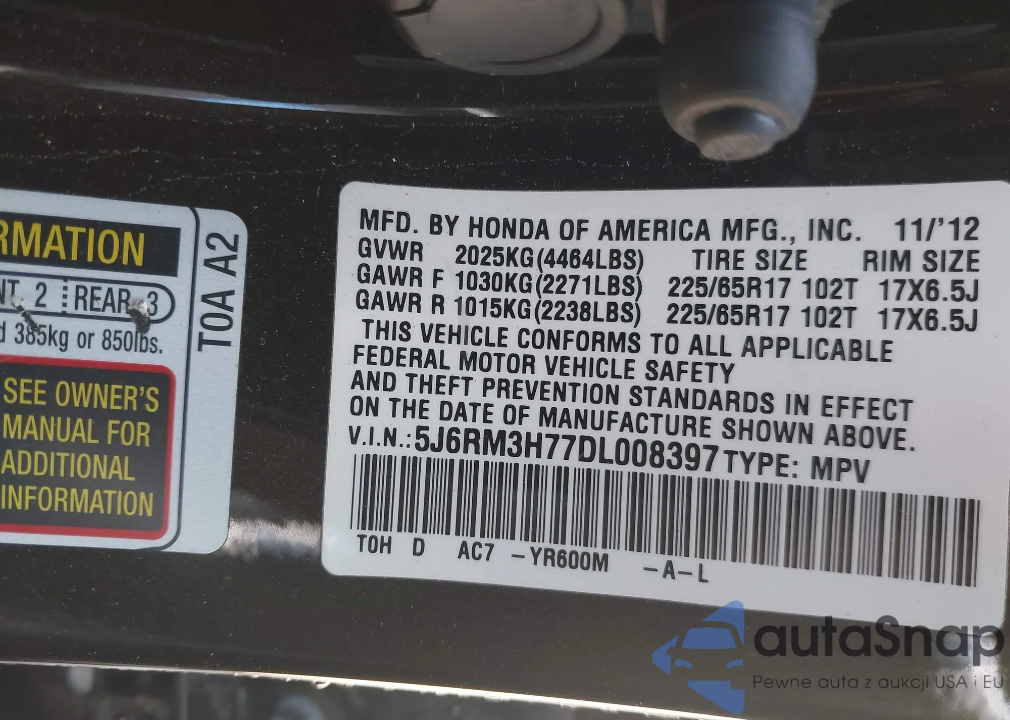• VIN 5J6RM3H77DL008397