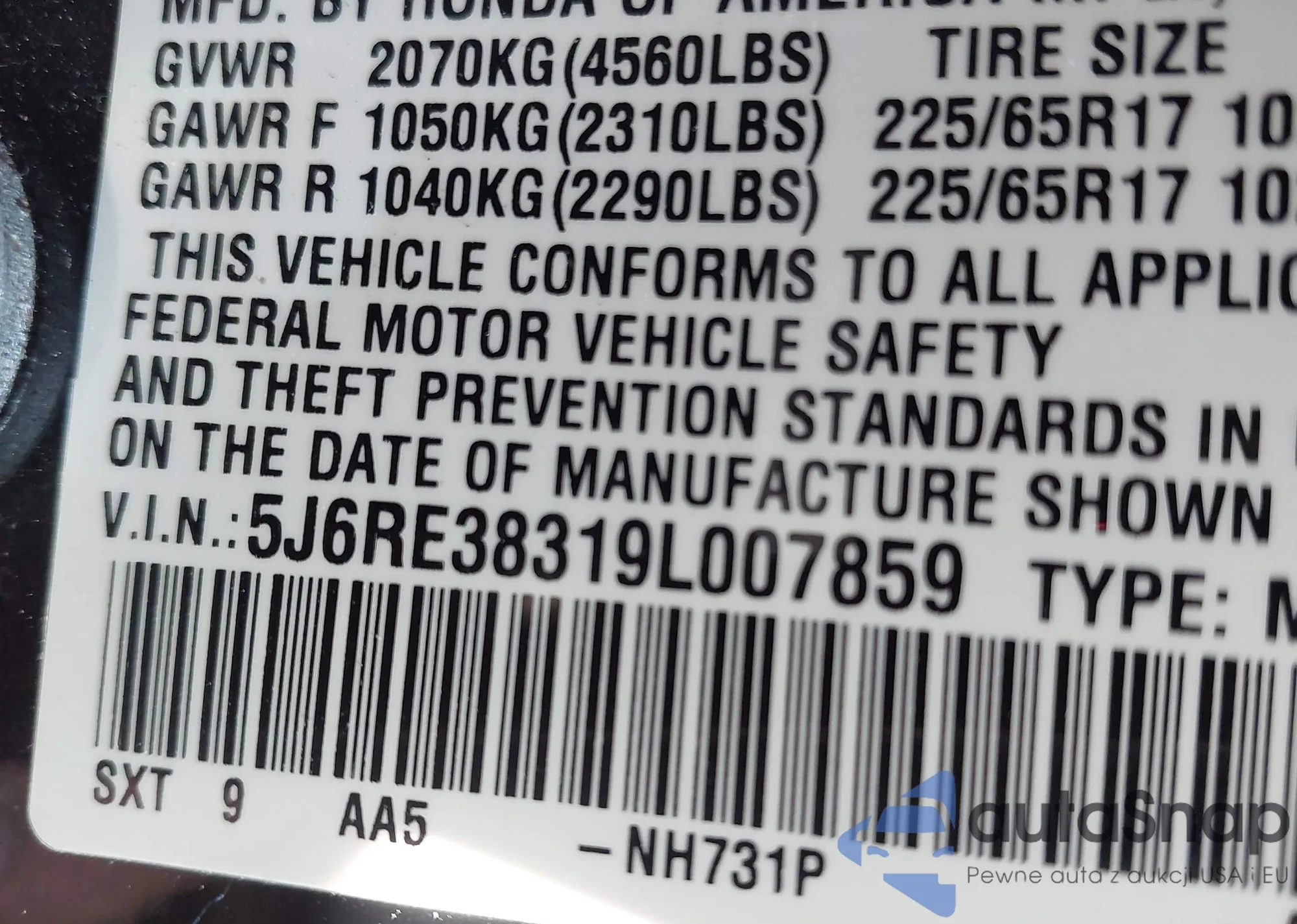 • VIN 5J6RE38319L007859